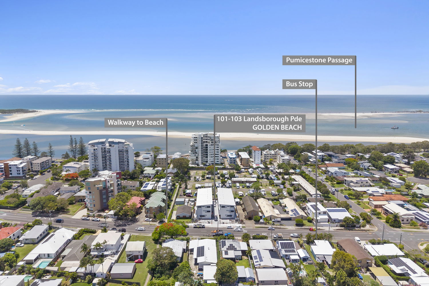 # A walkway adjacent to the townhouse provides convenient access to the Golden Beach Esplanade and Pumicestone Passage