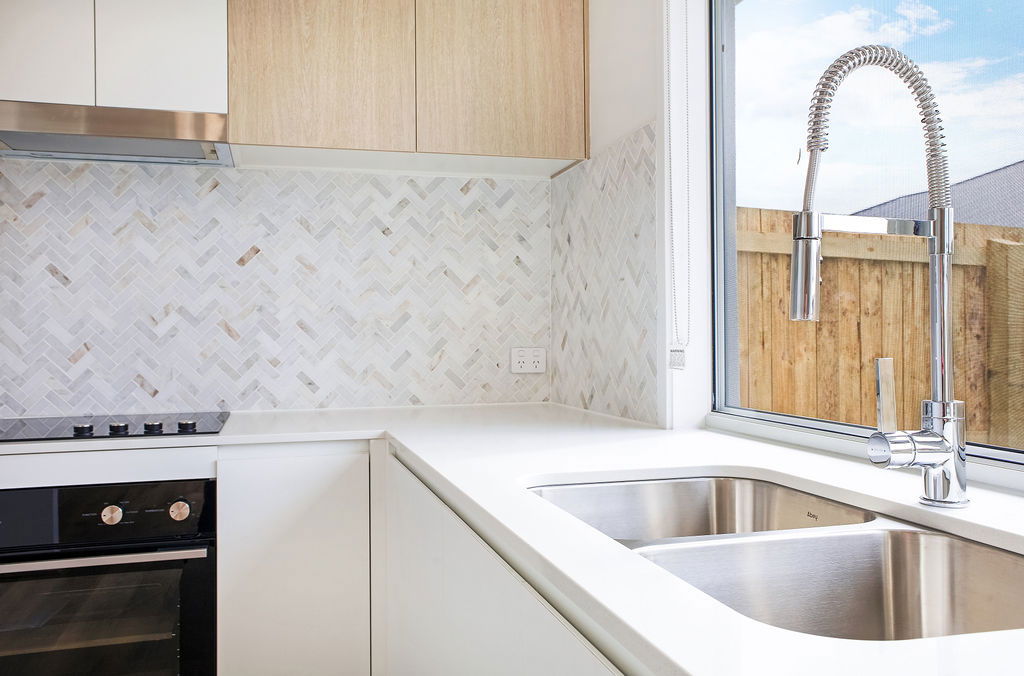 # Light filled kitchen with ample cupboard space and electric appliances including dishwasher