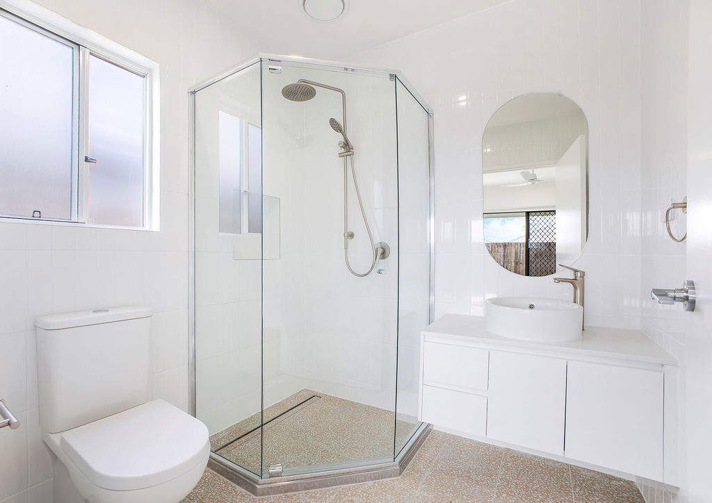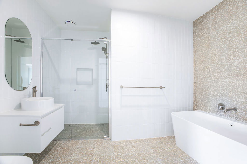 # Well-appointed main bathroom with shower, separate bath and storage to vanity