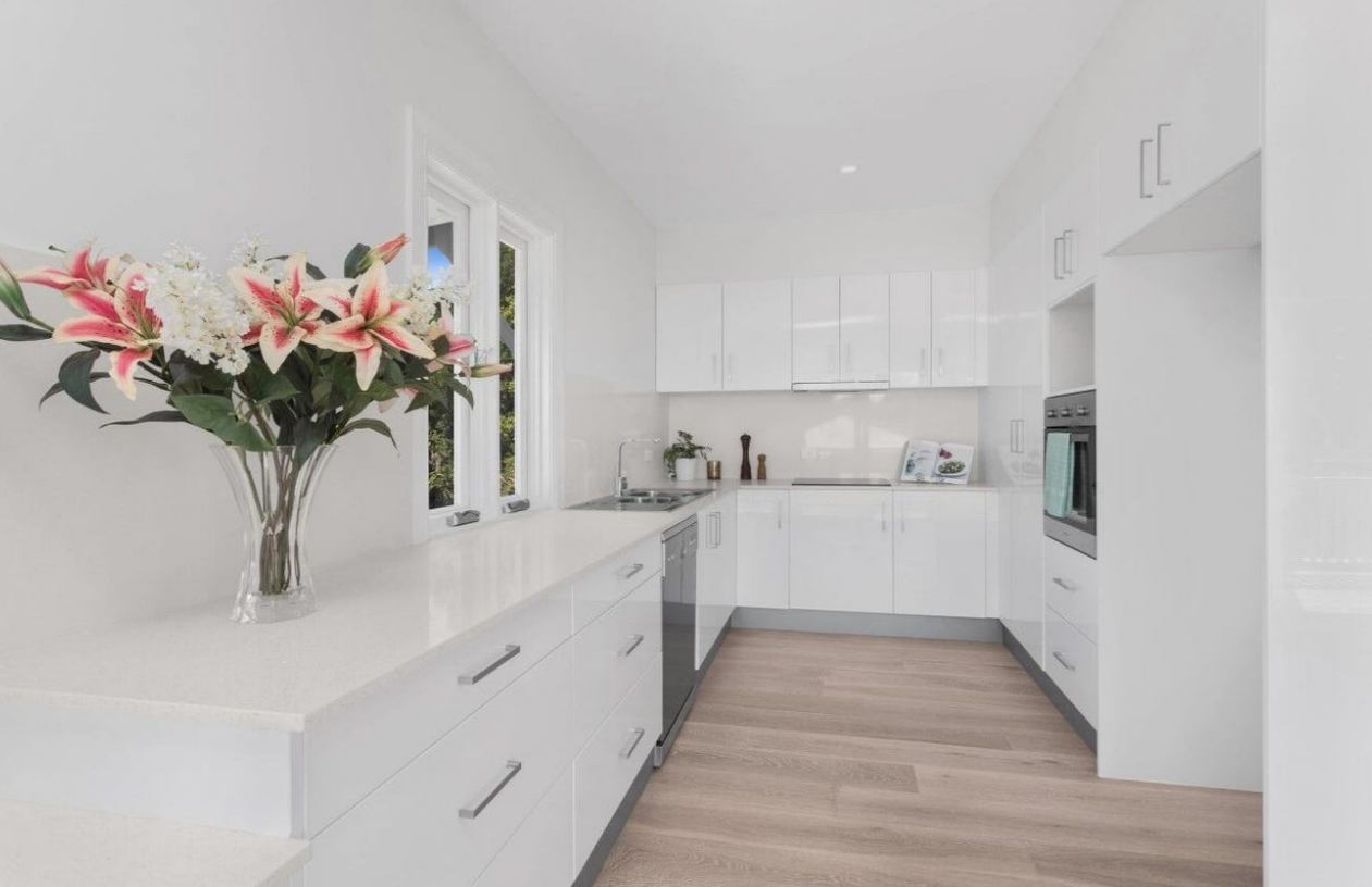 # Modern kitchen with appliances inclusive of dishwasher, rangehood, cooktop and oven. Large space for a fridge, plenty of storage to cupboards and ample bench space.