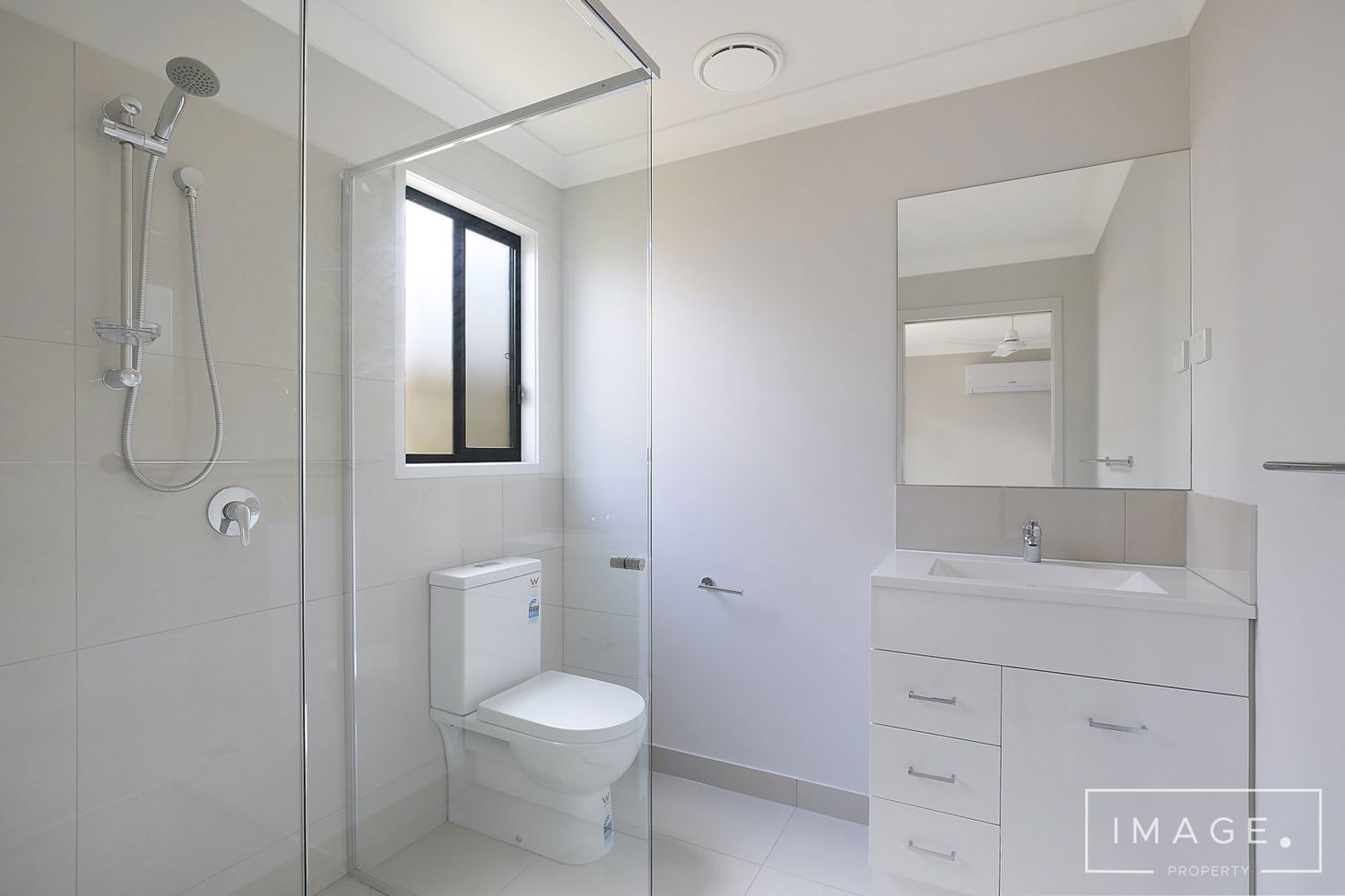 # Ensuite with single shower, toilet, and ample storage to vanity.