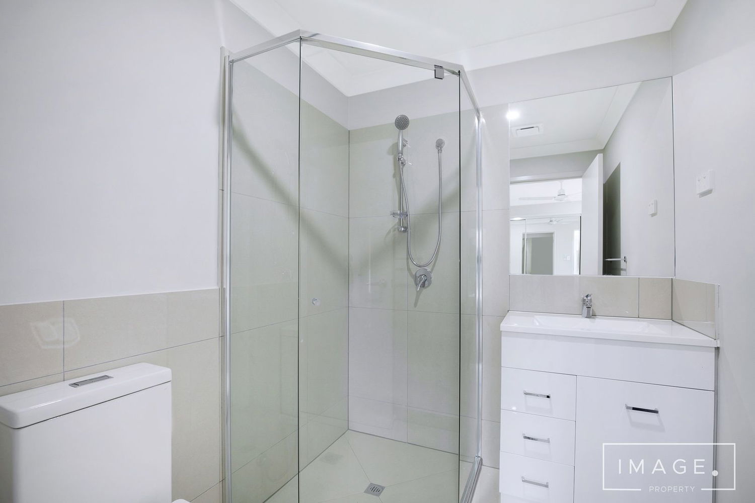 # Ensuite has large single shower cavity and storage to vanity