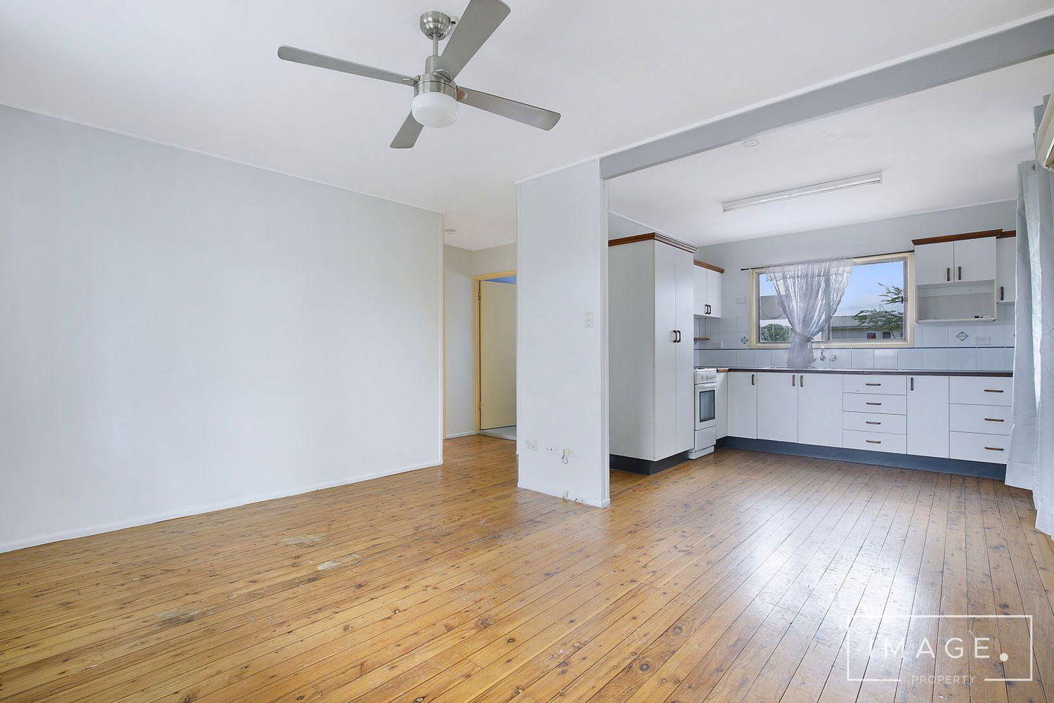 # Combined living and dining area with timber flooring, ceiling fan and A/C