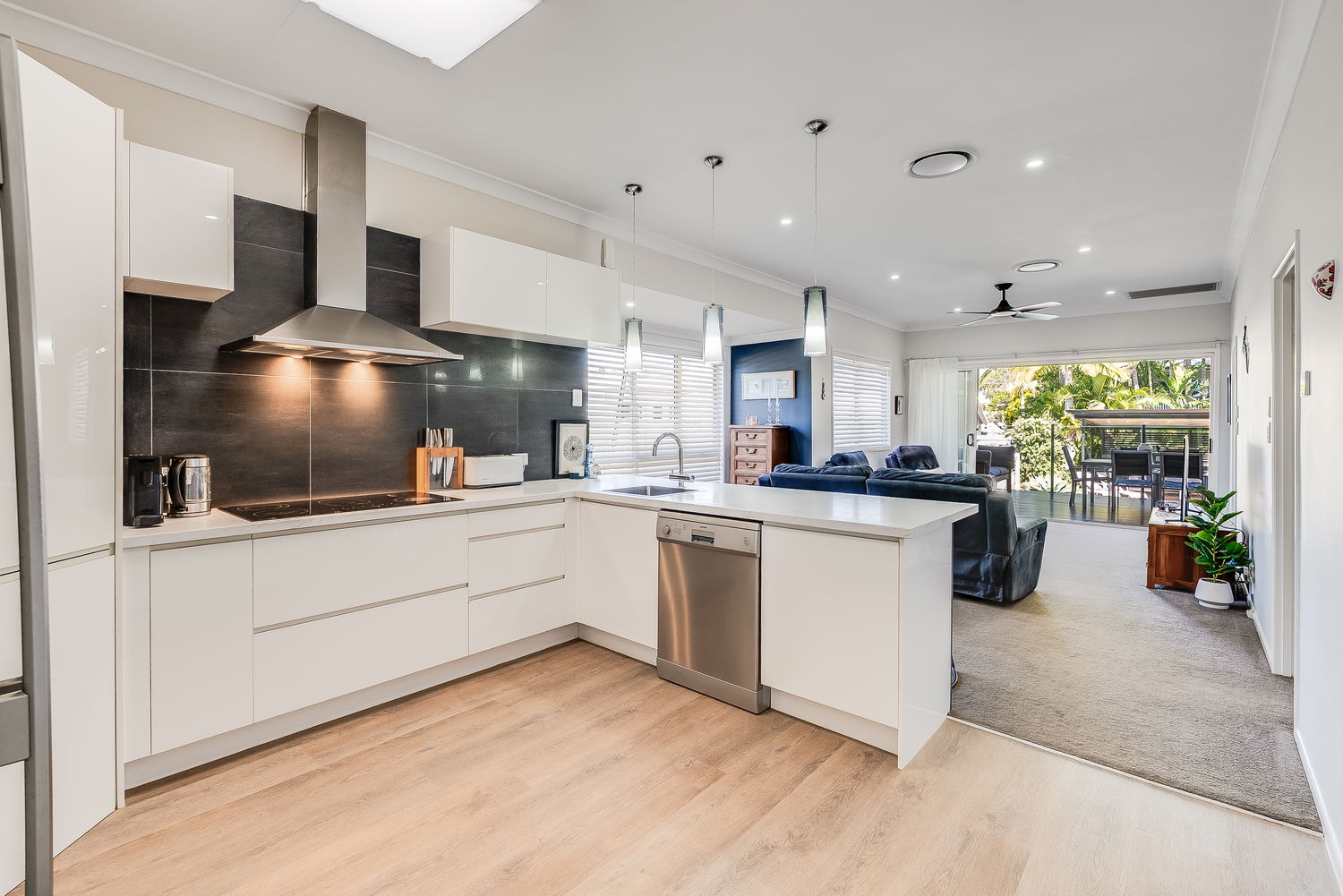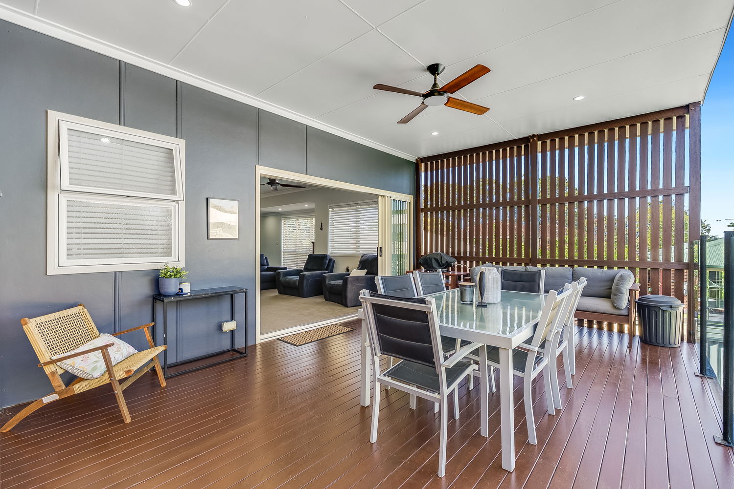 # Open-plan living area flowing seamlessly to a covered deck with ducted A/C and ceiling fan