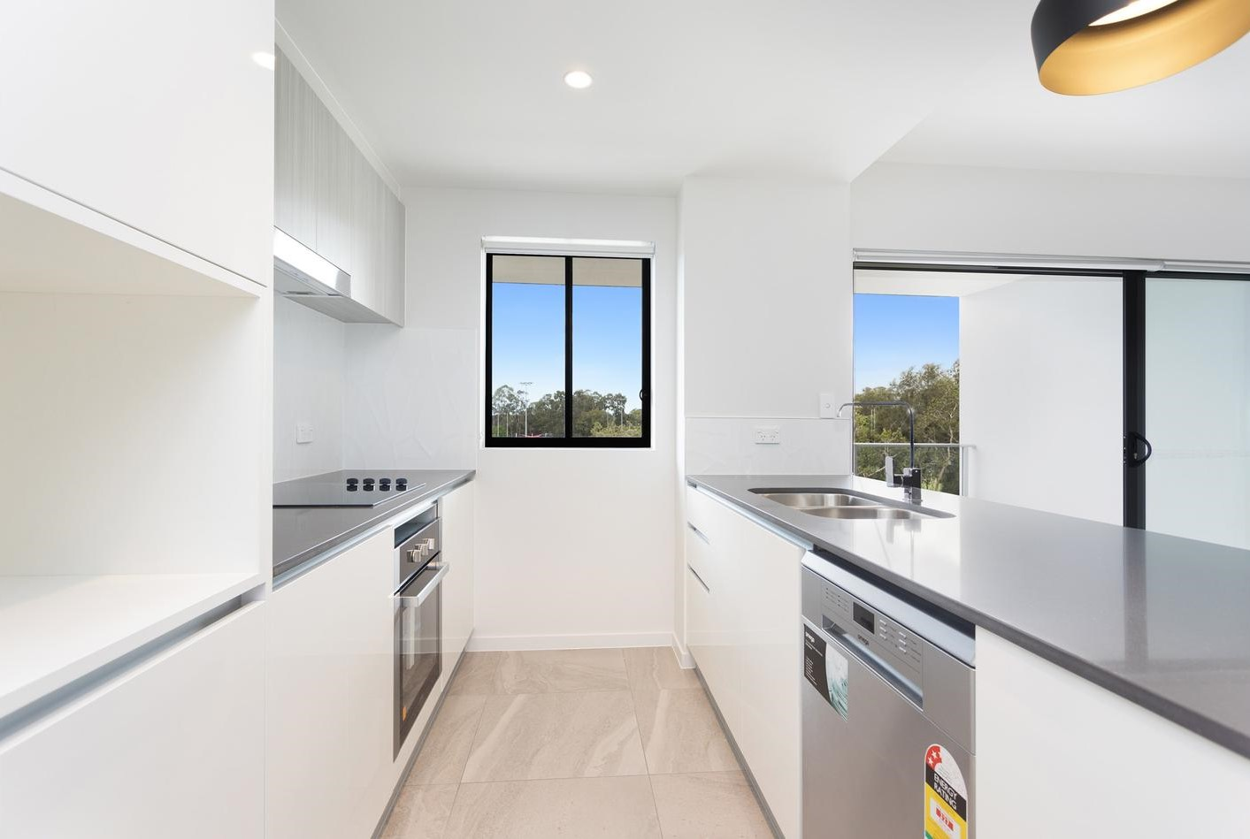 # Kitchen w/ stone benches, stainless steel appliances & soft close