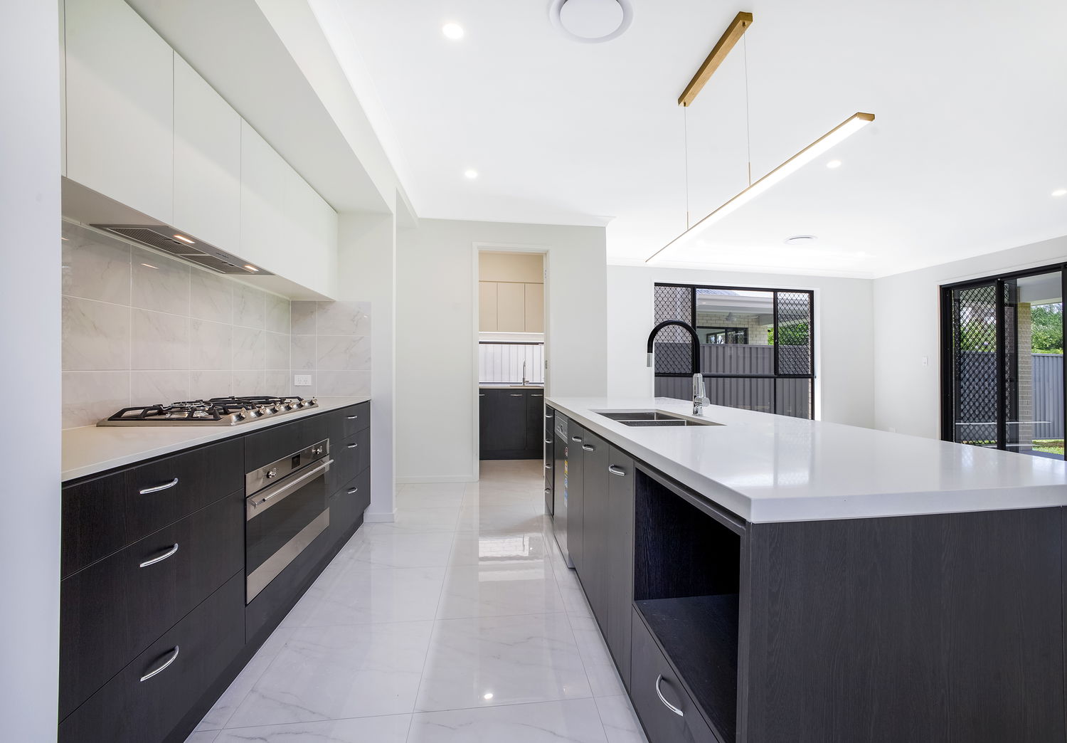 # Entertainer’s kitchen featuring stone benches, pantry, ample storage and stainless-steel appliances including dishwasher, gas cooktop, oven and rangehood – with butler pantry.