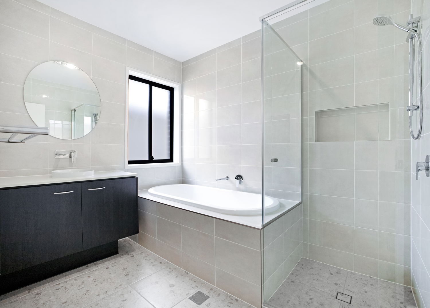 # Large family bathroom with single shower, separate bathtub and storage to vanity.