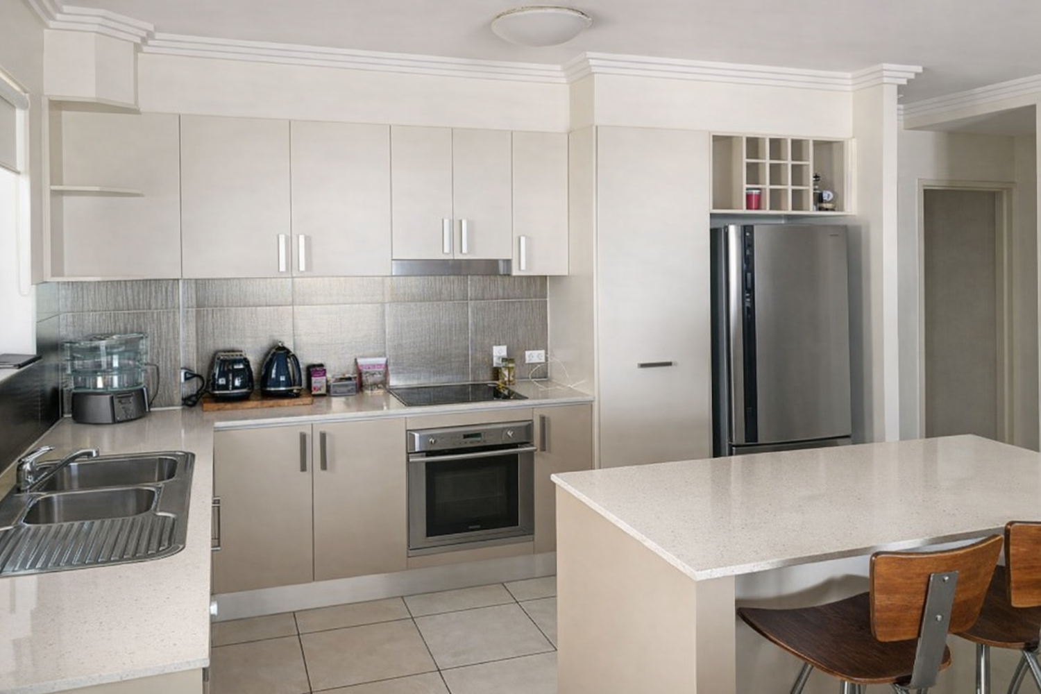 Gourmet chef’s kitchen featuring stone benchtops, quality stainless steel appliances, and sleek cabinetry.