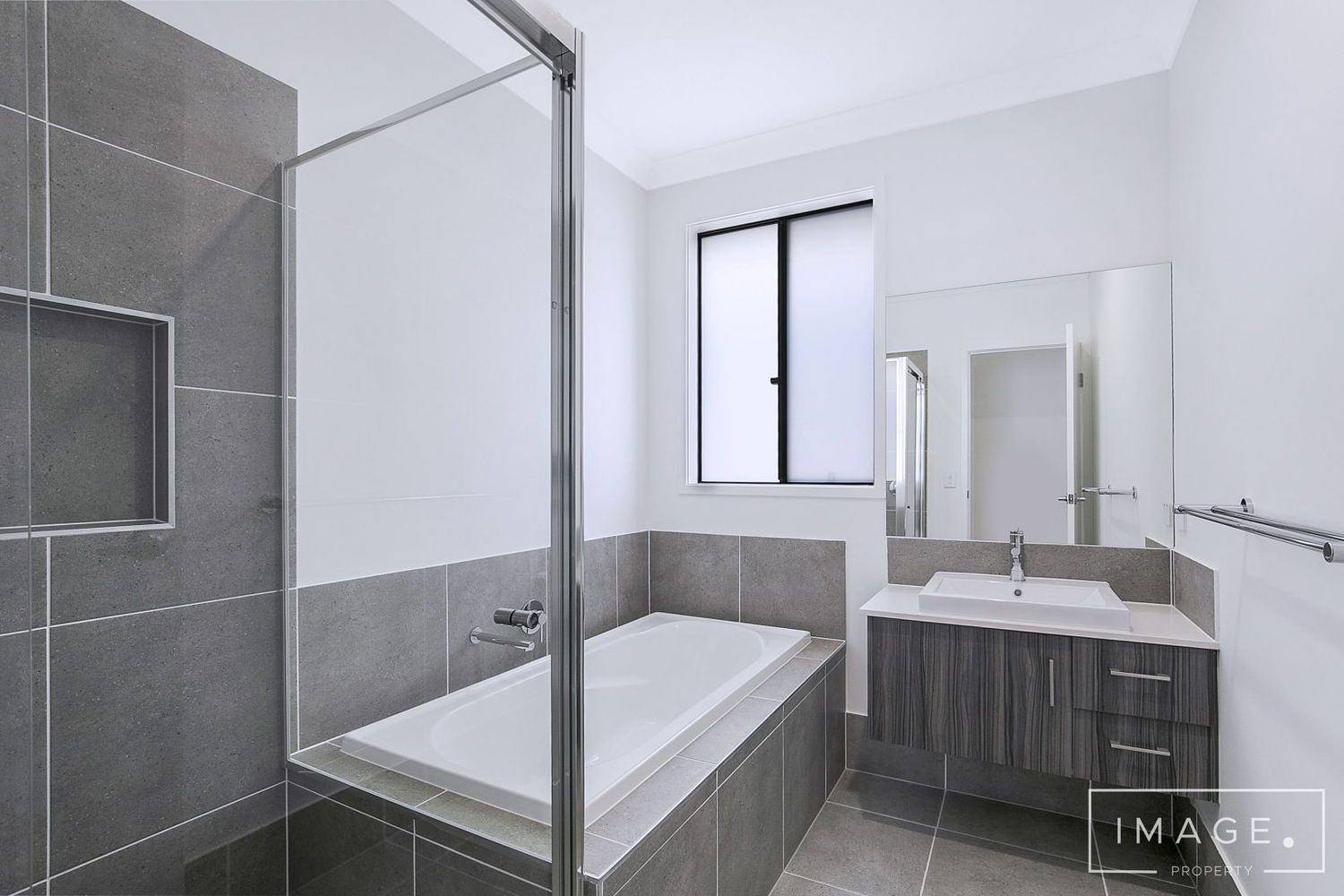 # Main bathroom with shower cavity and SEPARATE BATHTUB. Storage to vanity.