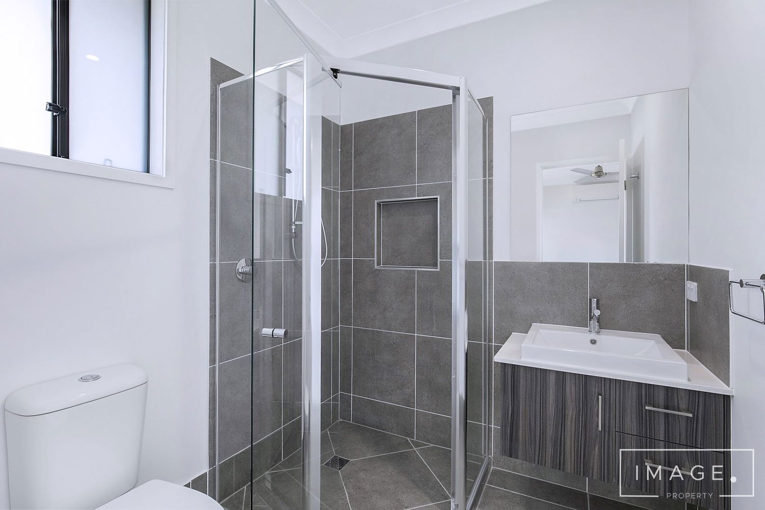 # Ensuite with large shower cavity and storage to vanity.