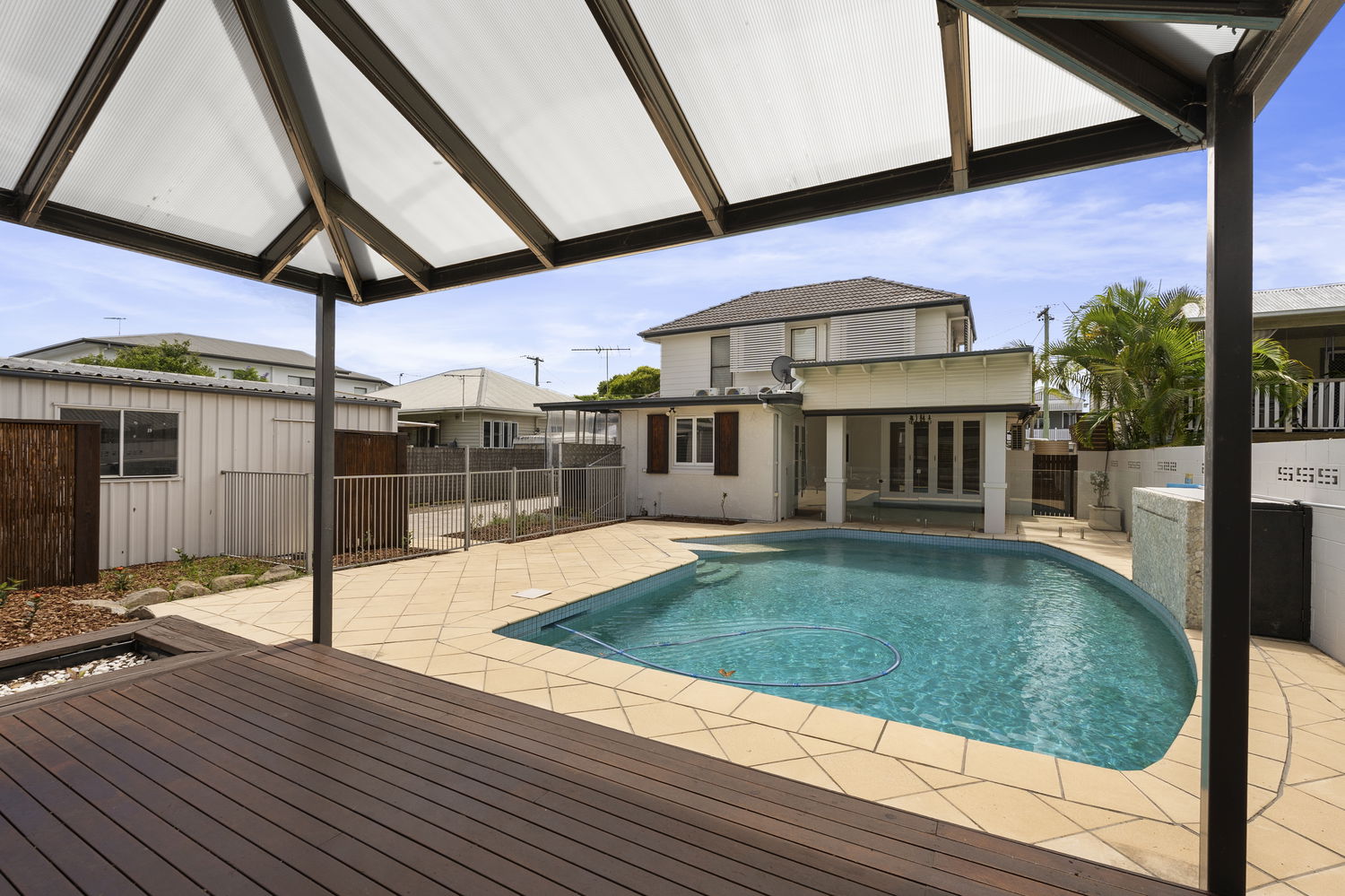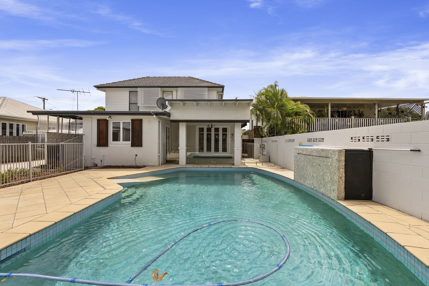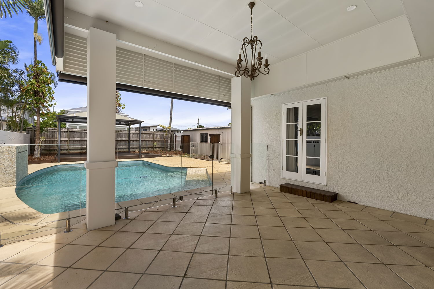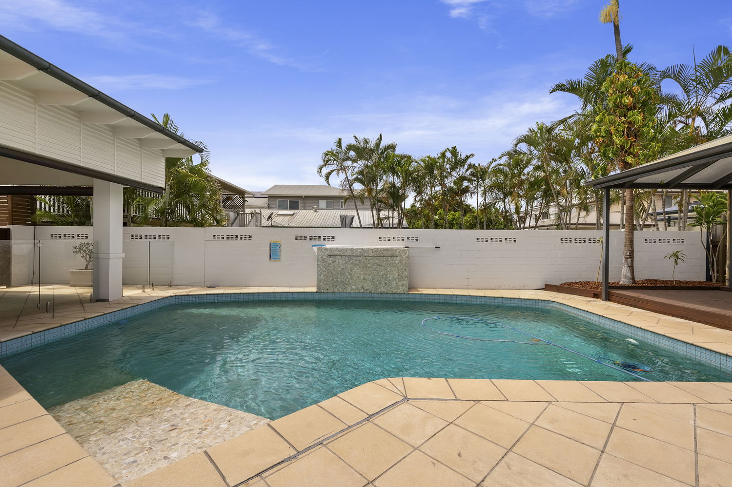 *Resort-Style Outdoor Entertaining:* The alfresco terrace and cabana overlook a stunning swimming pool with waterfall feature and wheelchair access, creating a private retreat perfect for hosting, relaxing, and enjoying Queensland’s outdoor lifestyle.