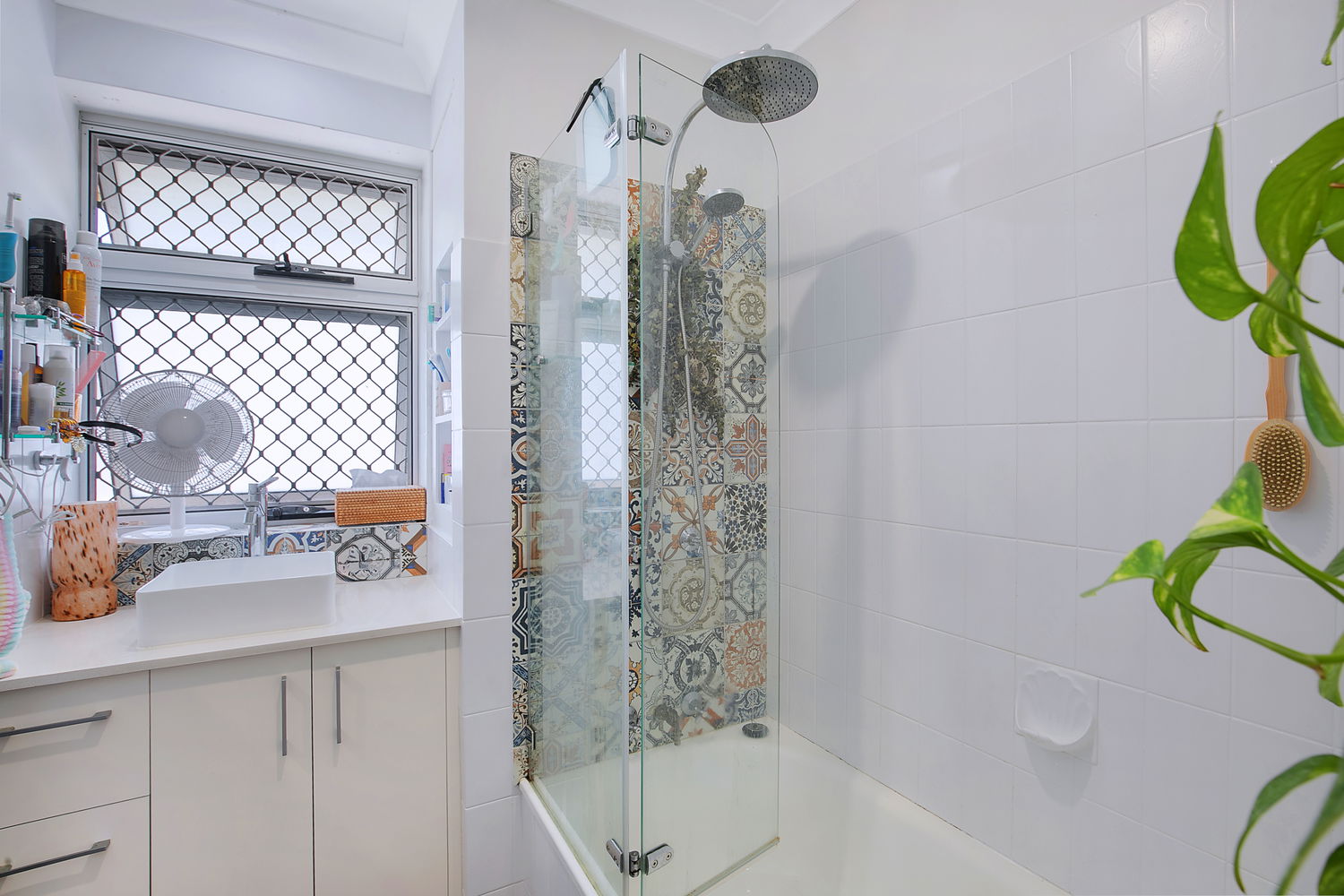 # Bathroom with shower over bath