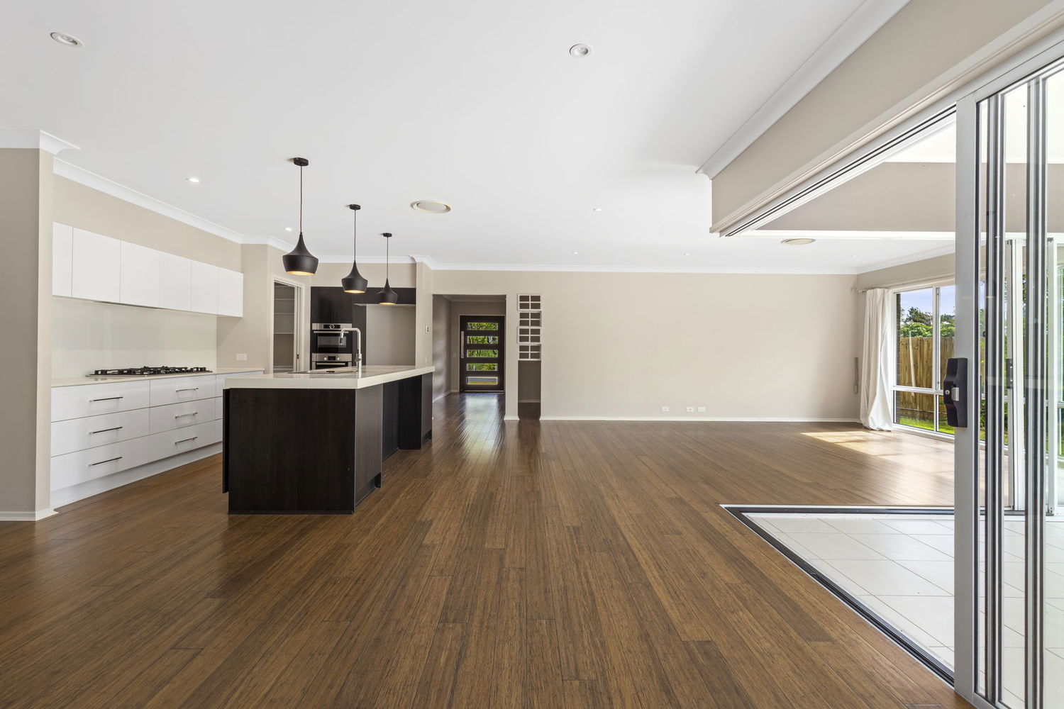 # Open-plan living and dining wrapping around the expansive alfresco via the stacker doors. Giving seamless flow to outside.