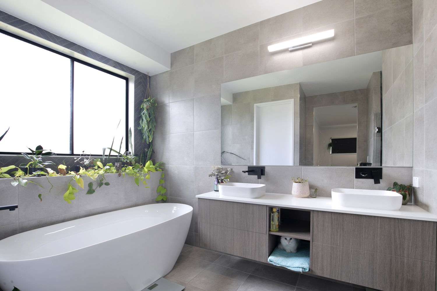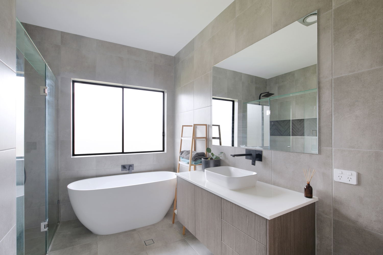 # Ensuite with large shower space, double basin with ample storage to vanity, separate freestanding bath and separate toilet with door.