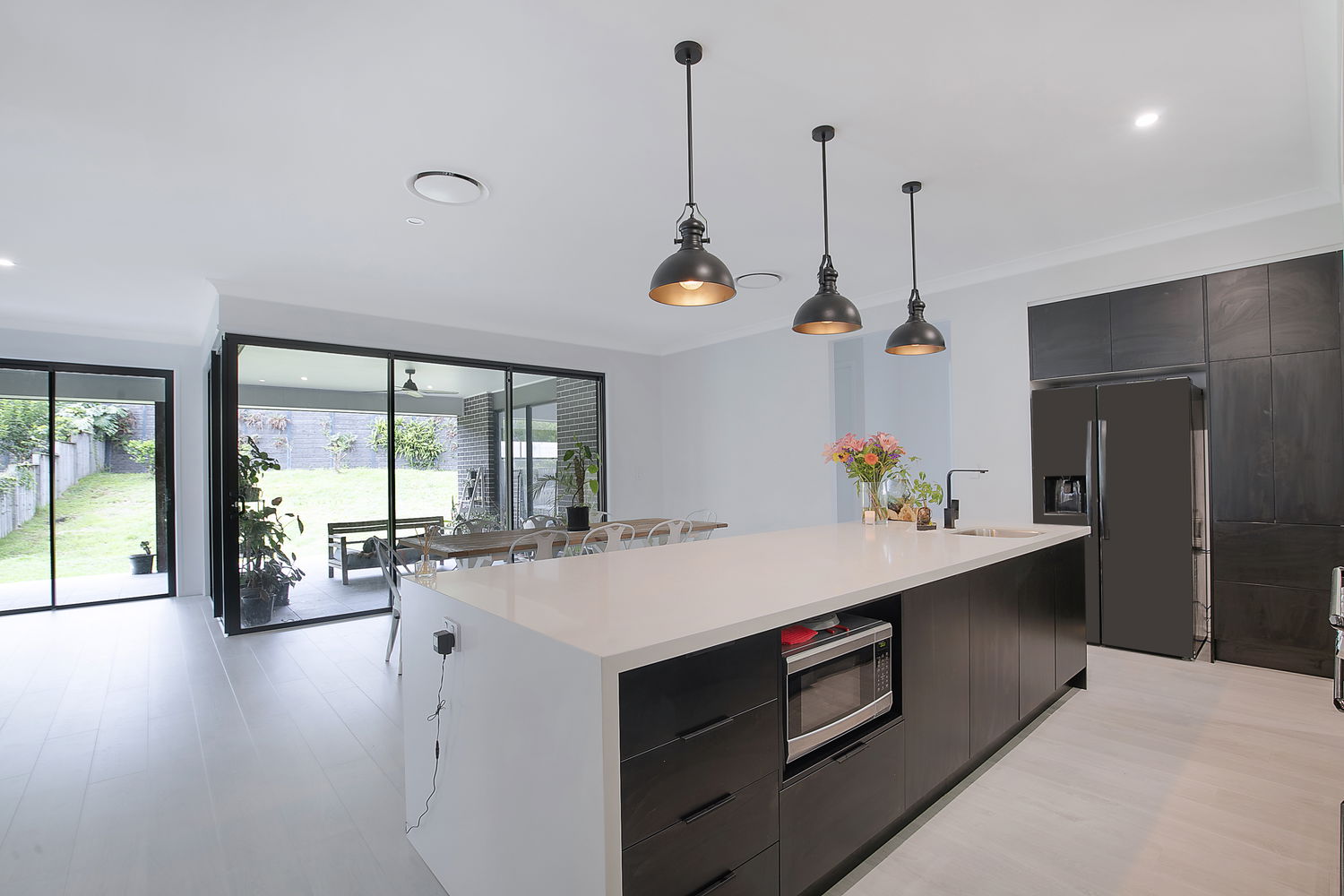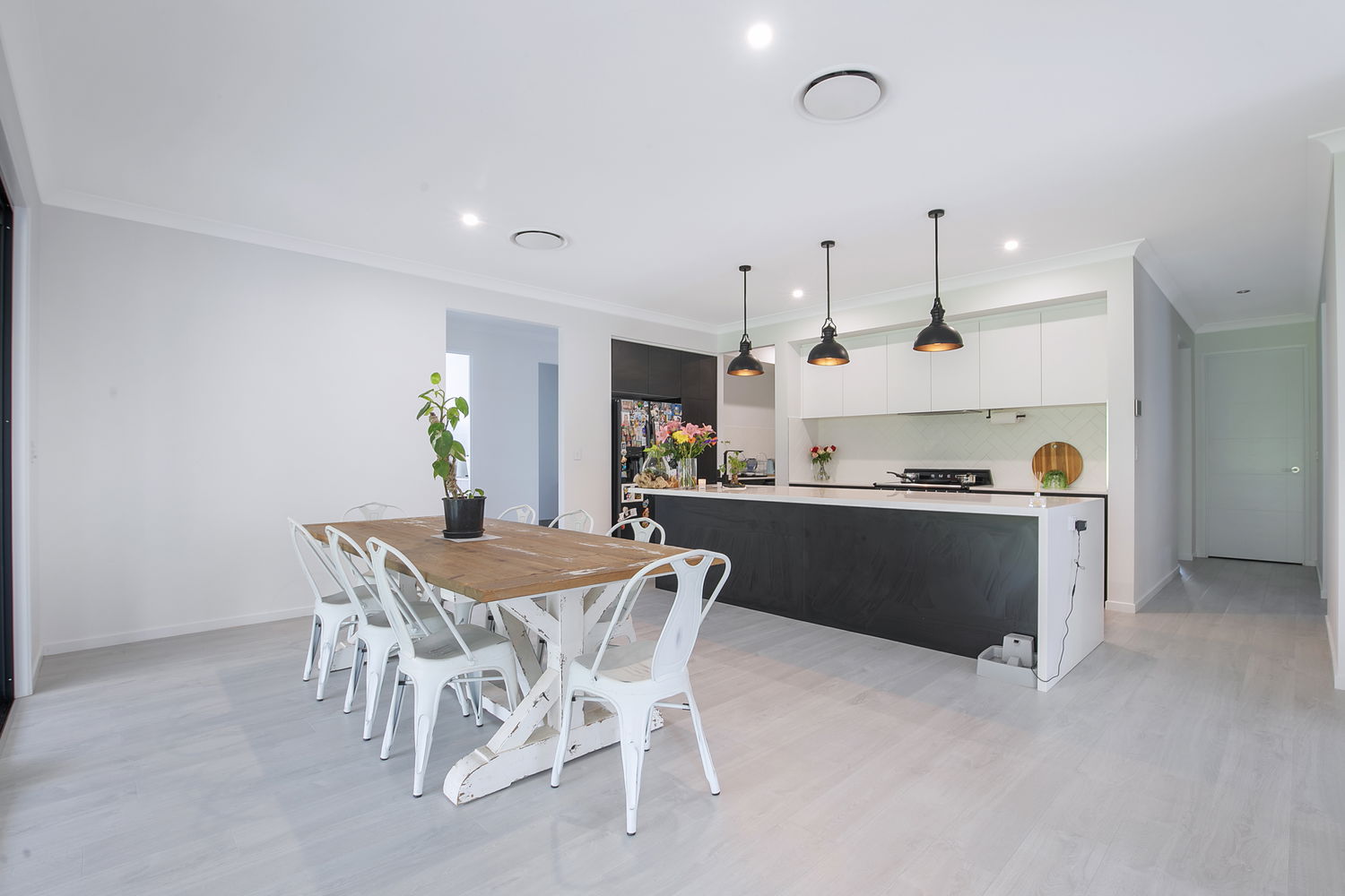 # Open-plan living and dining opening out to the expansive alfresco via the stacker doors. Giving seamless flow to outside.
