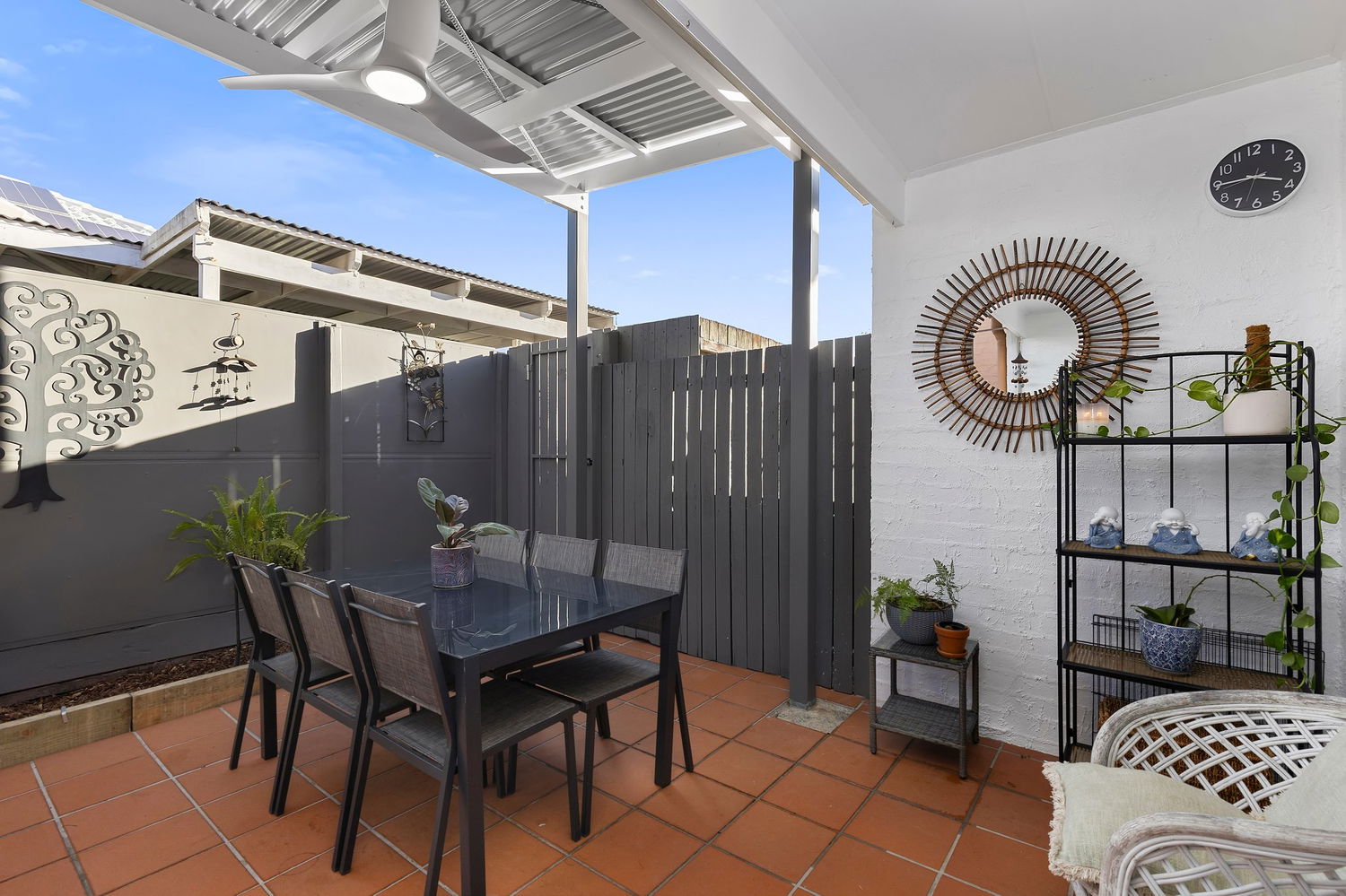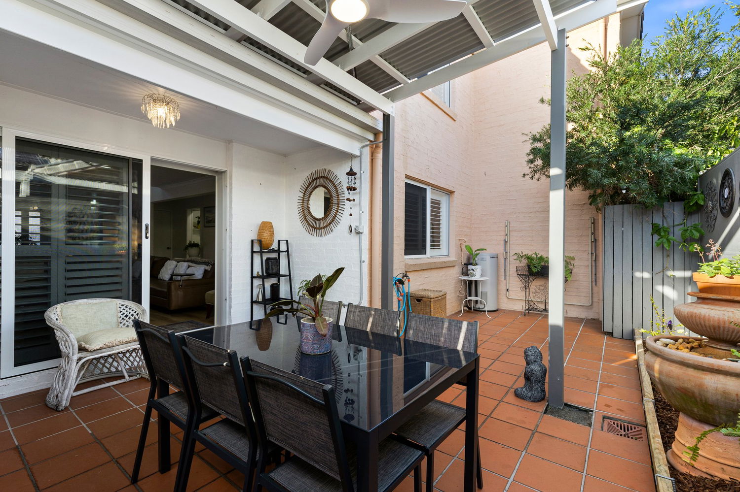 # Large, tiled courtyard including pergola with ceiling fan and light – great for entertaining and alfresco dining.