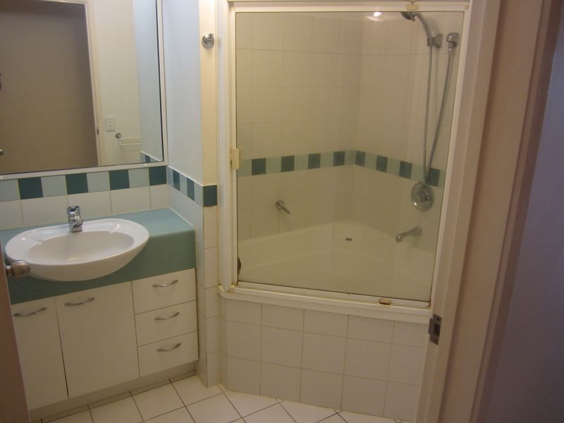 # Well-appointed main bathroom with vanity and shower over bath