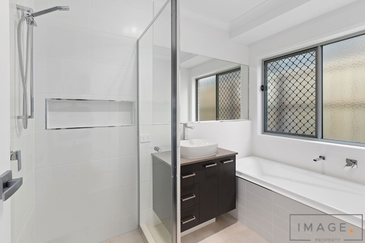 # Main bathroom with shower cavity, separate bathtub and storage to vanity.