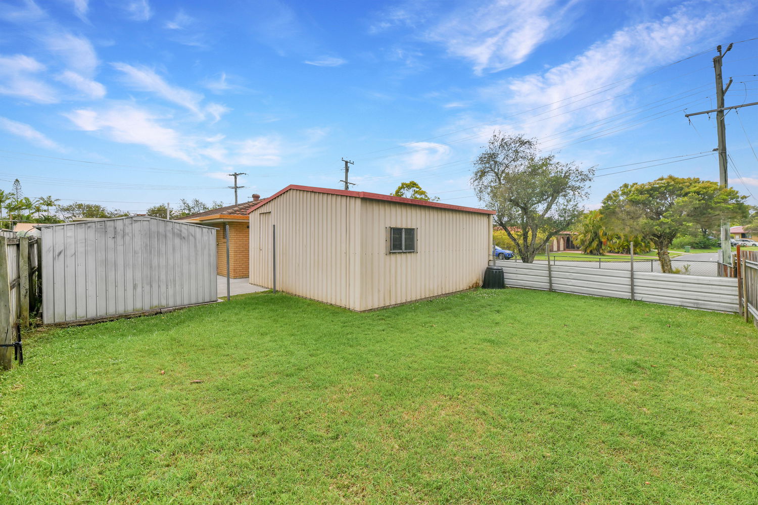# Fully fenced backyard with large storage shed and plenty of yard space