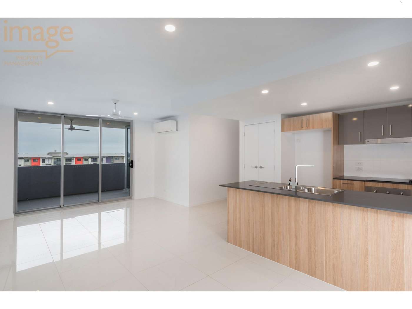 # Open plan living and dining with split system air conditioning and ceiling fan, sliding doors leading onto a private balcony