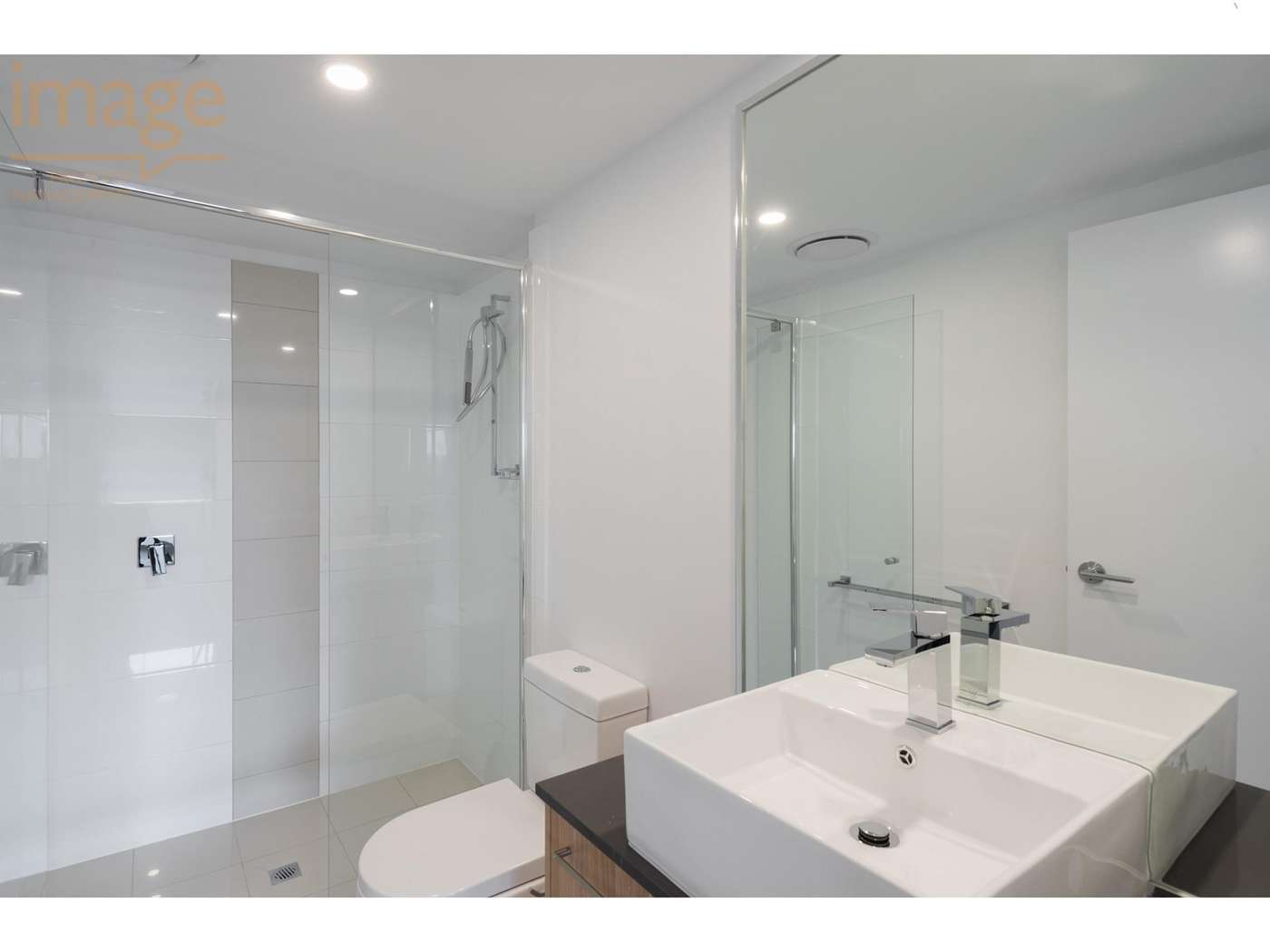 # Ensuite with well-sized shower cavity and ample storage to timber finish vanity
