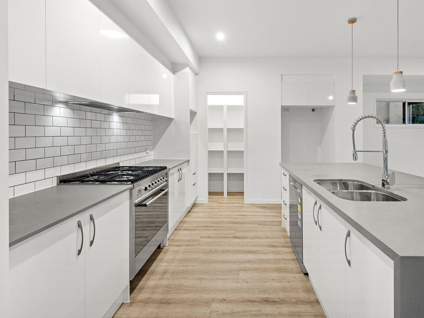 # Modern kitchen with STAINLESS STEEL appliances inclusive of DISHWASHER, 5 Burner Freestanding Cooker oven and rangehood. AMPLE STORAGE to cupboards & drawers & AMPLE BENCH SPACE with ISLAND BENCH DOUBLING AS BREAKFAST BAR with Smart stone Benchtops. Well- sized fridge cavity & WALK-IN PANTRY.