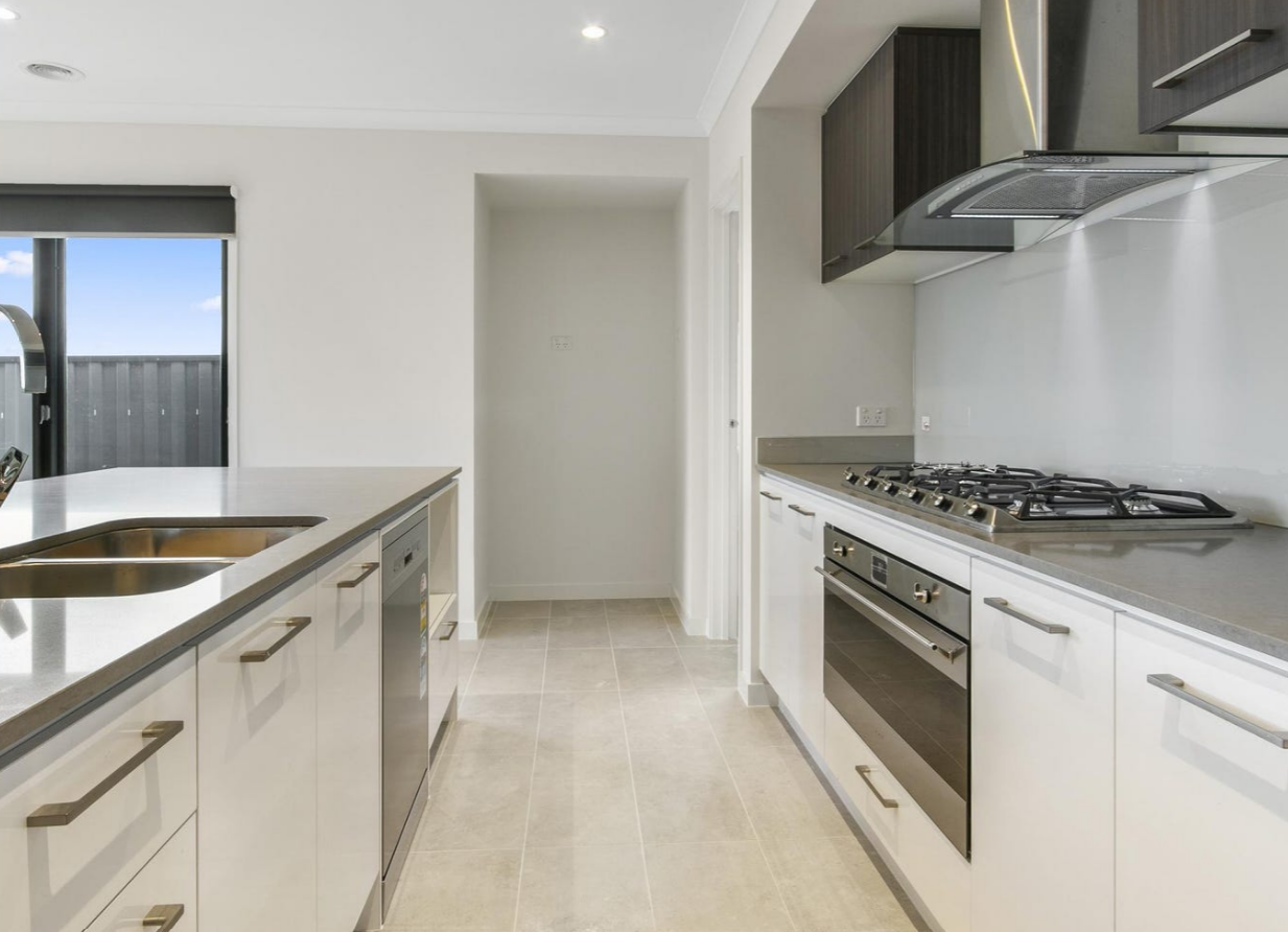 The heart of the home boasts a modern kitchen complete with stainless steel appliances, ample storage, and a large island bench—perfect for entertaining or family meals.