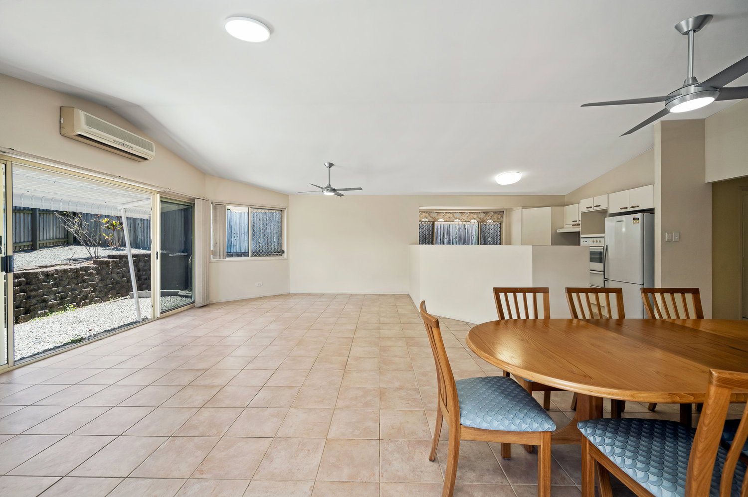 # Tiled open-plan living with high raked ceilings, air conditioning and ceiling fans