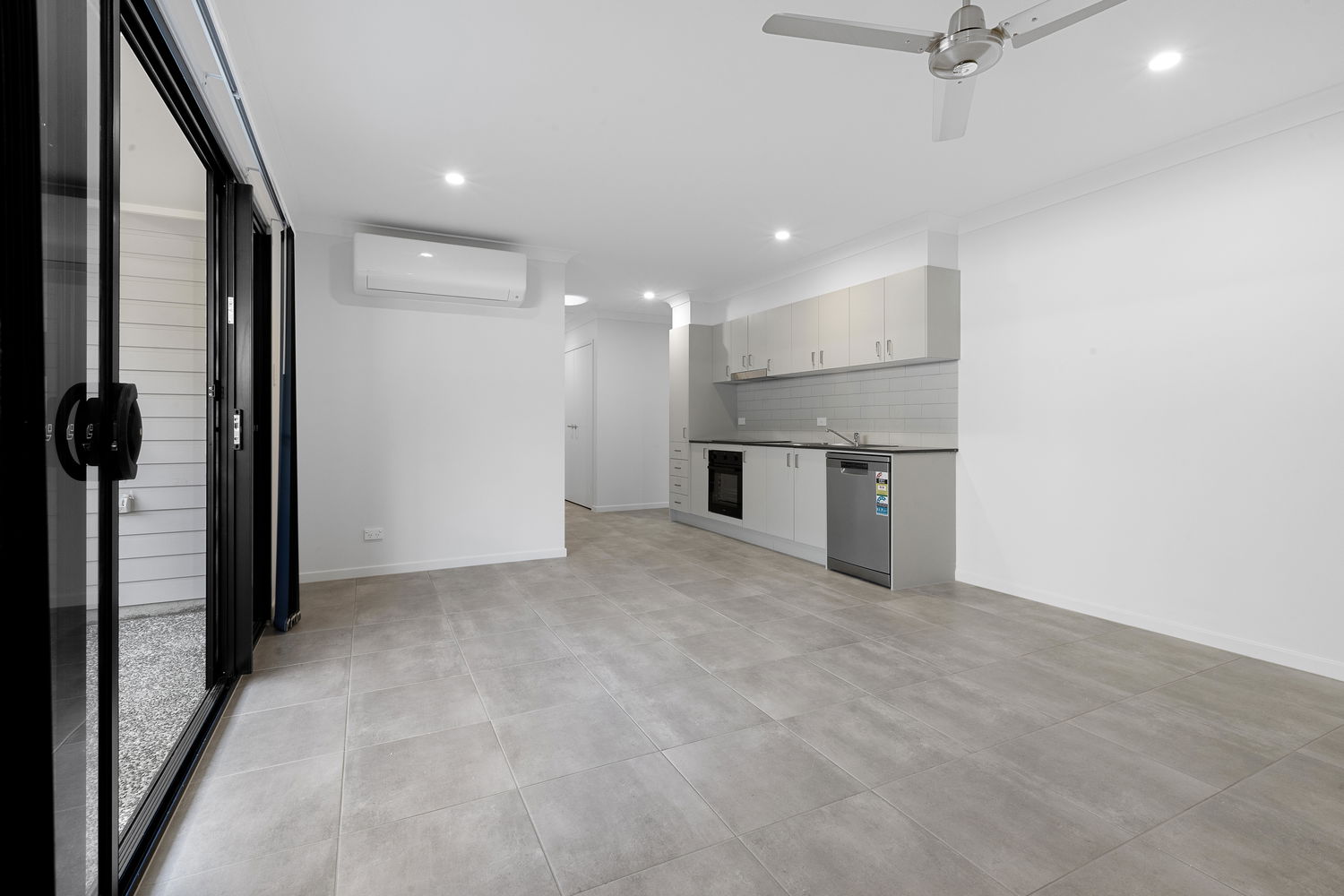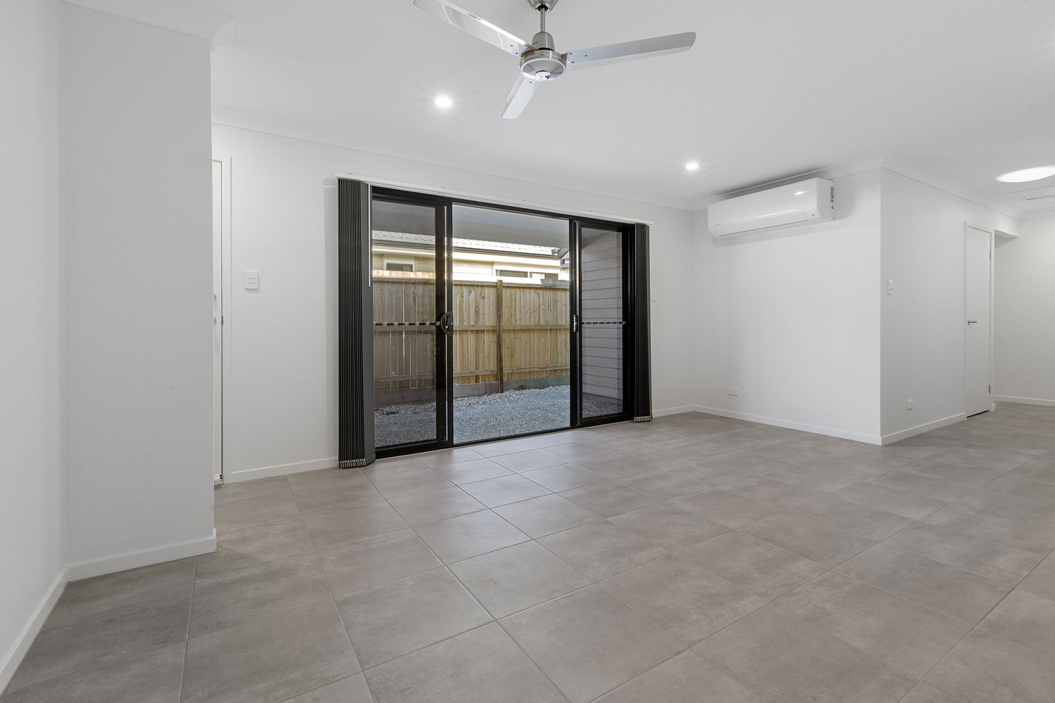 # Open plan living and dining with split system air conditioning, ceiling fan, and sliding door access to the covered outdoor area