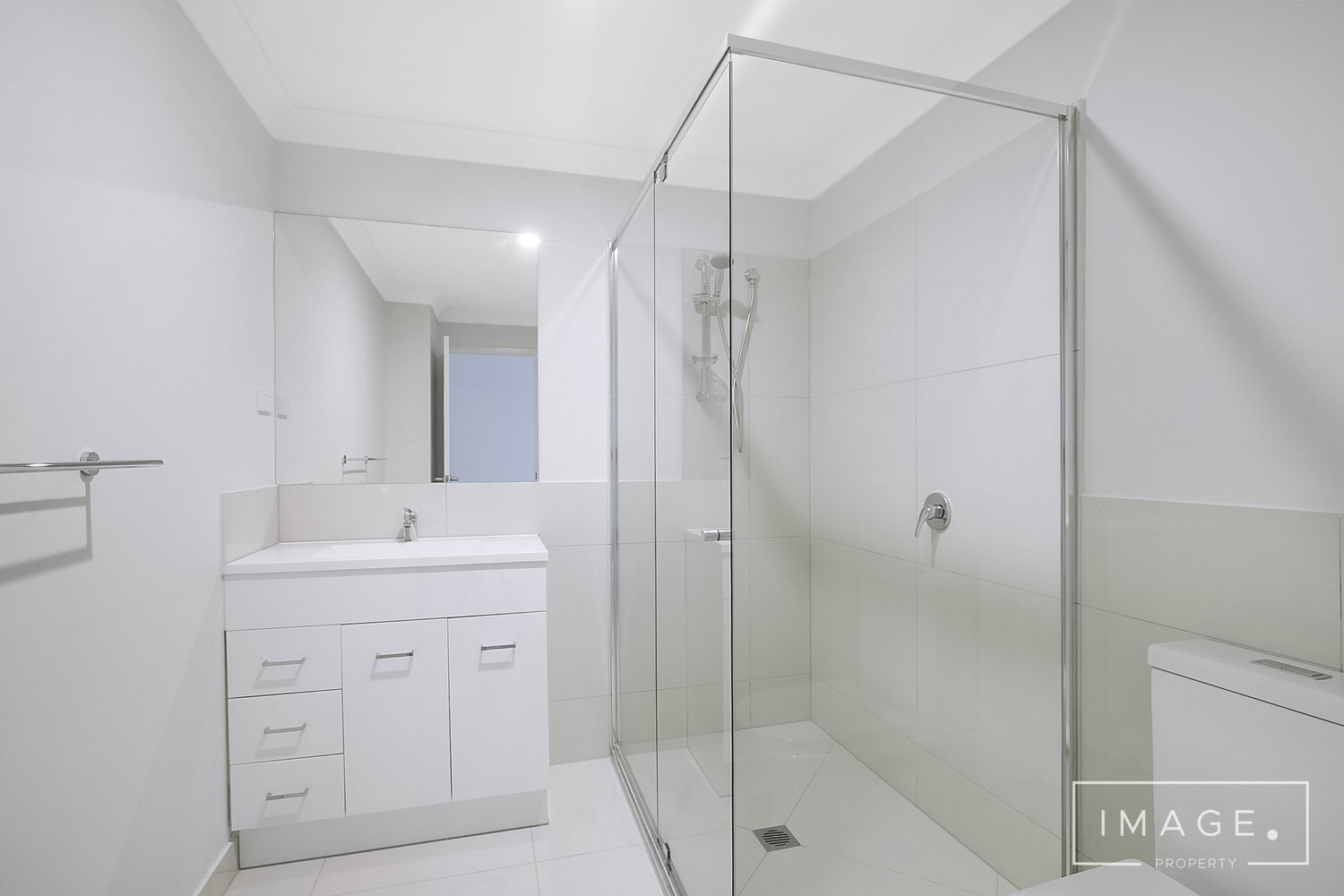 # Bathroom with shower cavity and ample storage to vanity.