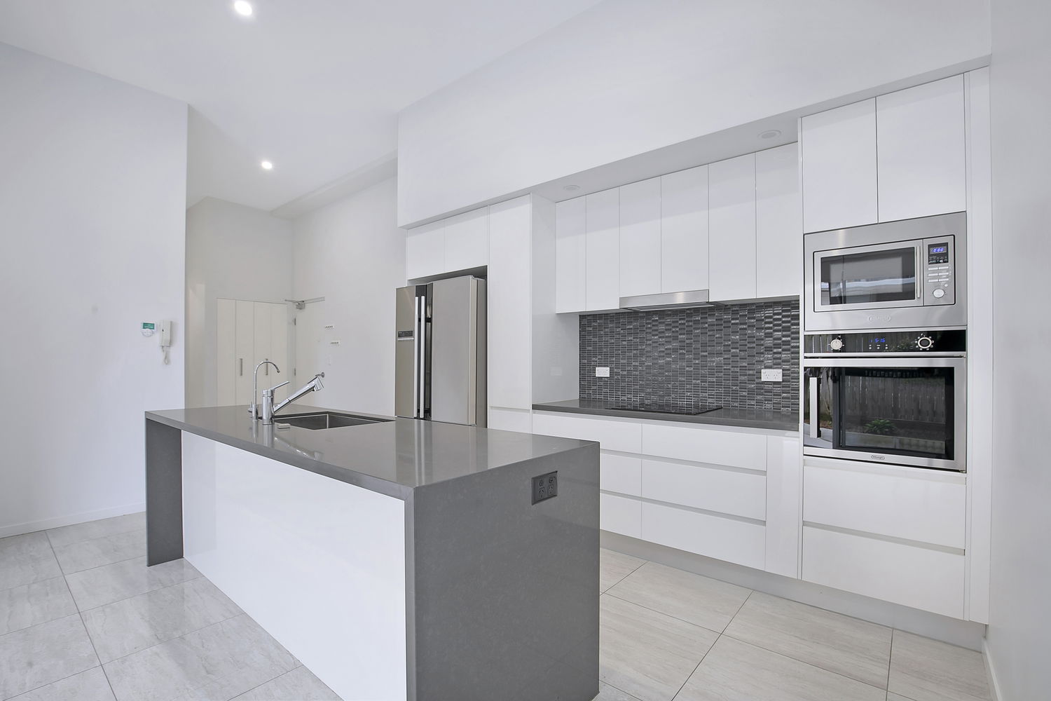 # Modern kitchen with ample cabinetry space, stainless steel De’Longhi brand appliances including a convectional microwave and filter drinking system