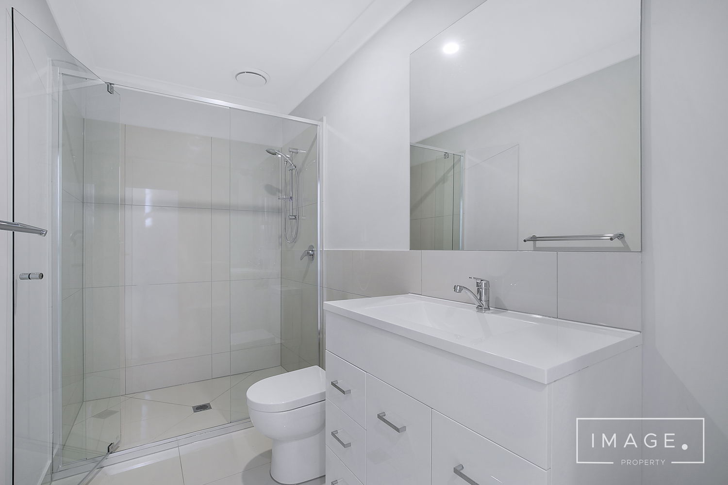 # Bathroom with large shower cavity and ample storage to vanity