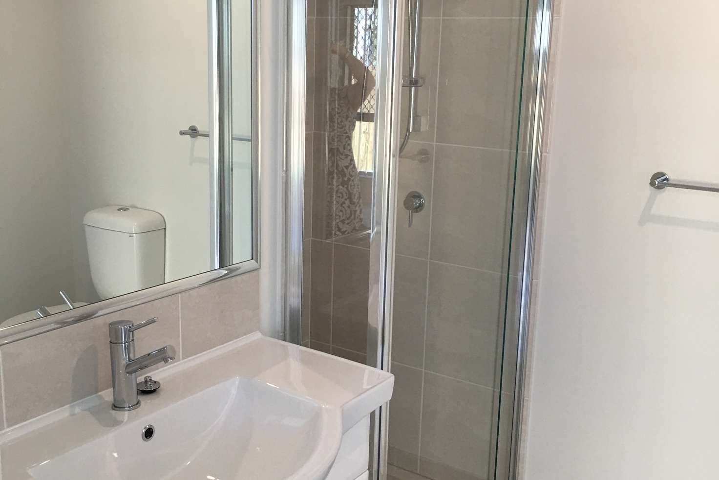# One well-sized bedroom with a large built-in wardrobe, carpet, ceiling fan and modern ensuite with plenty of storage