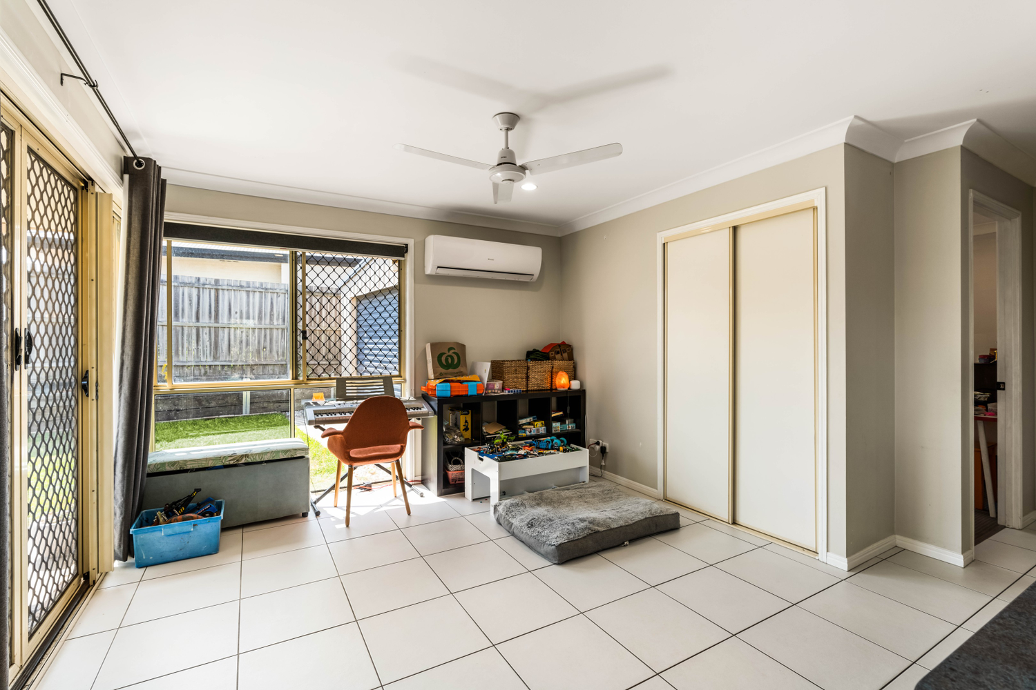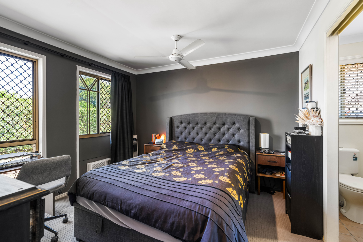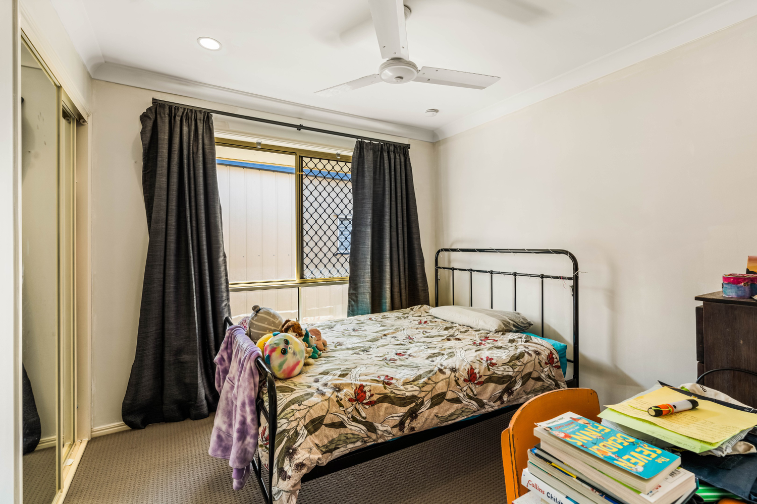 # Main bedroom with ceiling fan, security screens and built in wardrobes