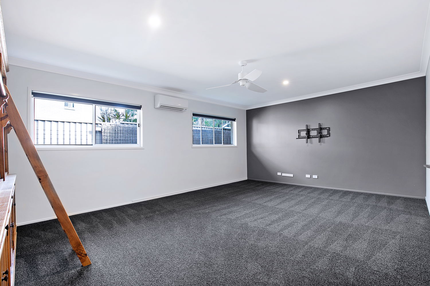 # Large separate media room with air-conditioning, block out blinds and carpet for added comfort with built in storage.