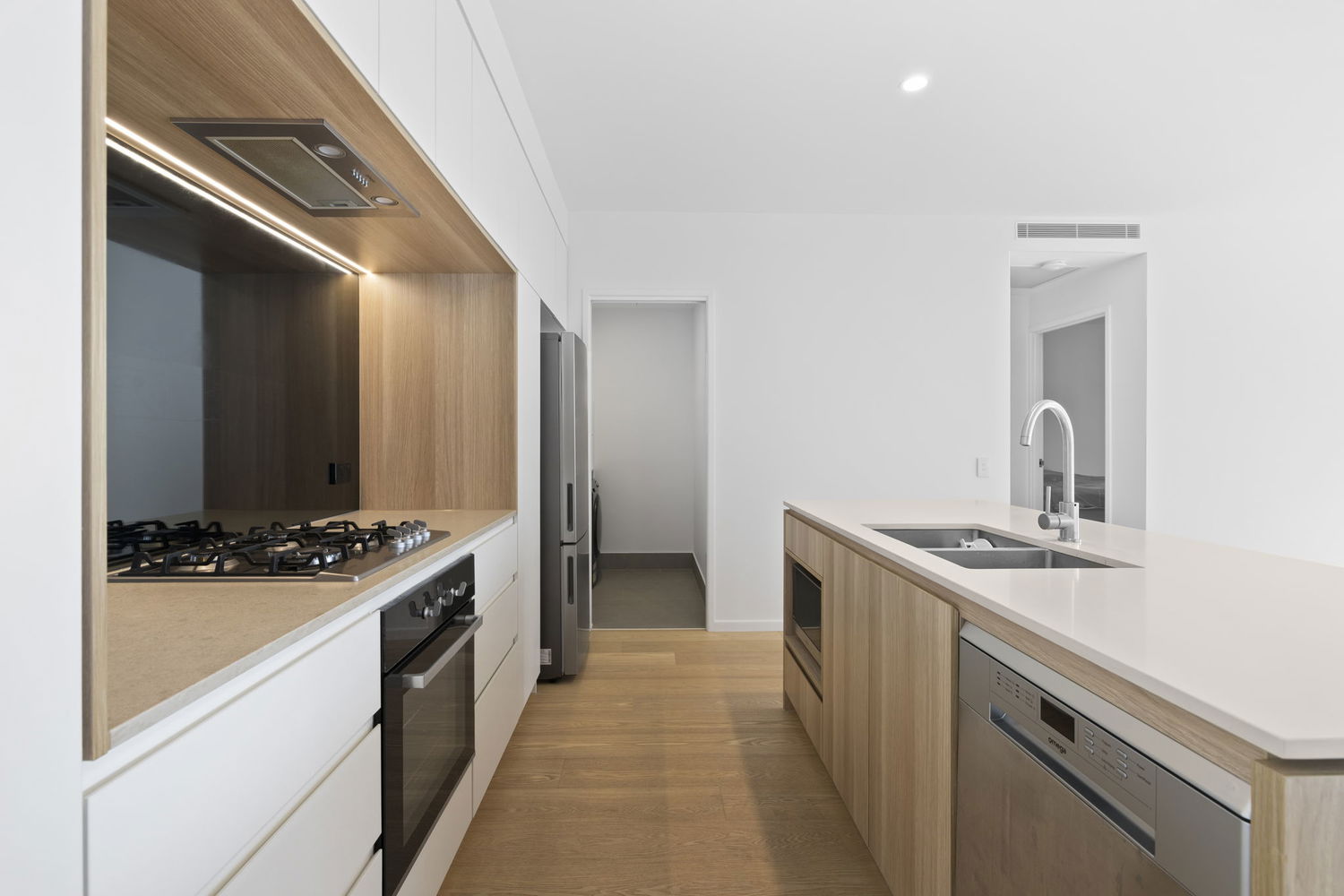 # Executive kitchen with appliances inclusive of gas cooktop, oven, rangehood and dishwasher. Stone benchtops doubling as breakfast bar. Ample storage to cupboards and drawers.