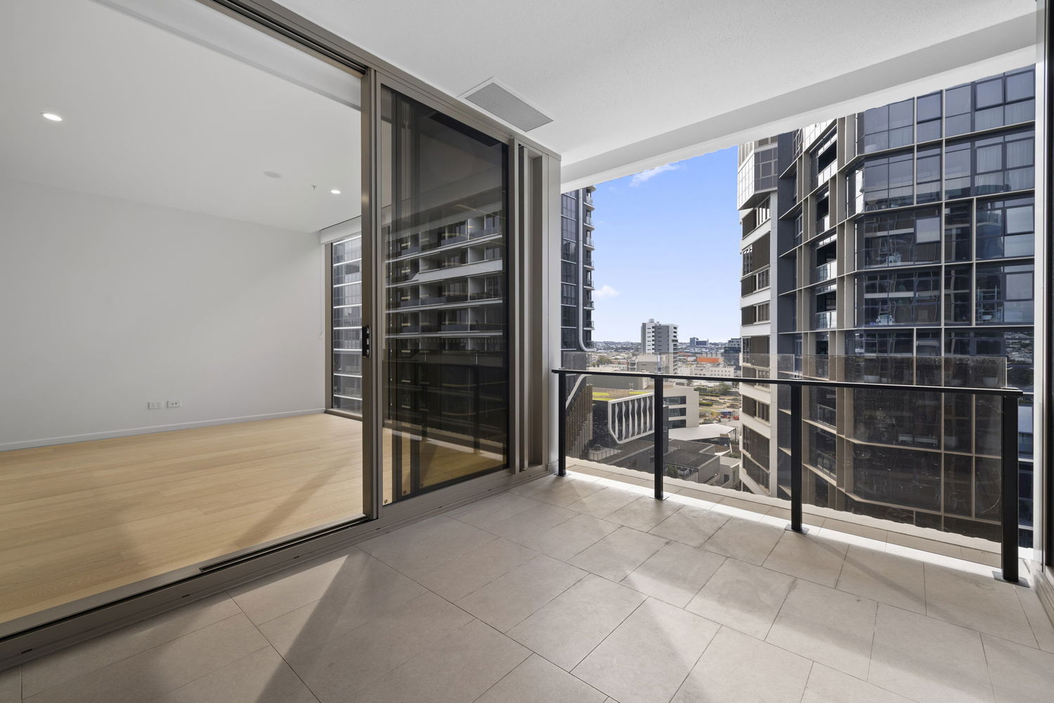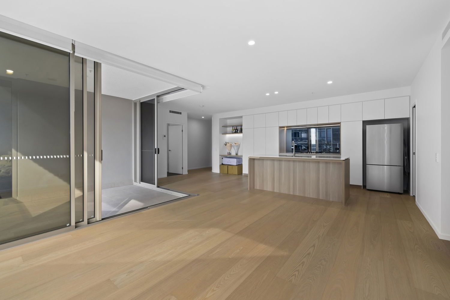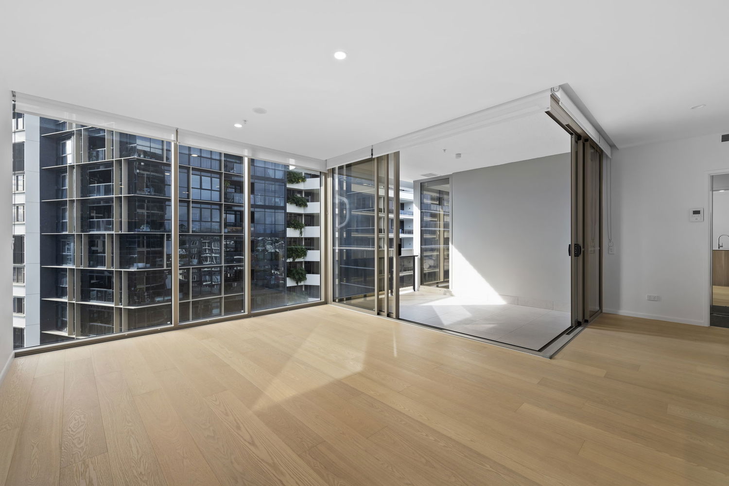 # Large natural light open plan living and dining area opening via stacker doors out to the private balcony with expansive views of the city.
