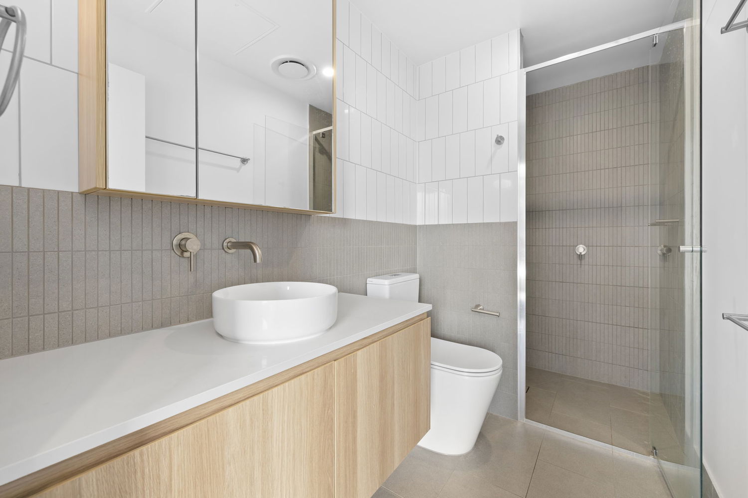 # Luxury ensuite with large shower space, toilet and storage to vanity and mirrored cabinets.