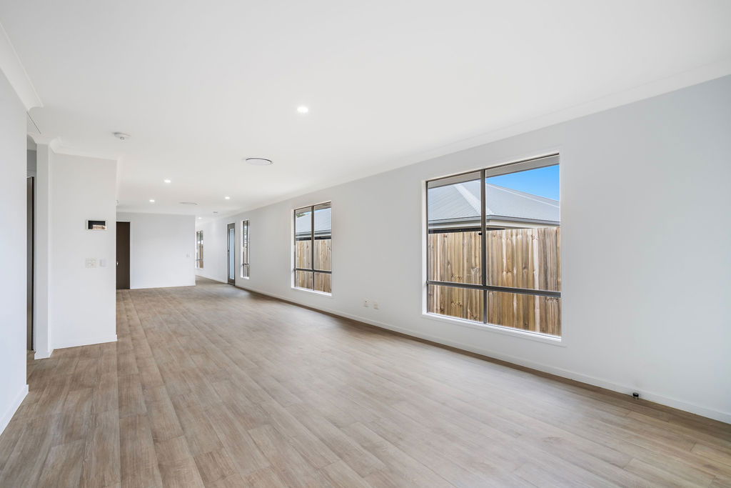 # Flexible open-plan living – oversized combined lounge, dining, and kitchen zone ideal for shared or independent living arrangements, with vinyl plank timber-look flooring and LED downlighting.