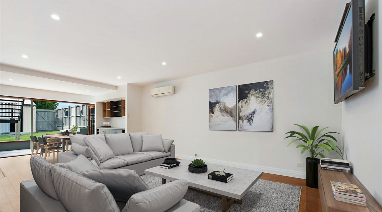 # Open plan living areas with polished floorboards opening out to undercover balcony