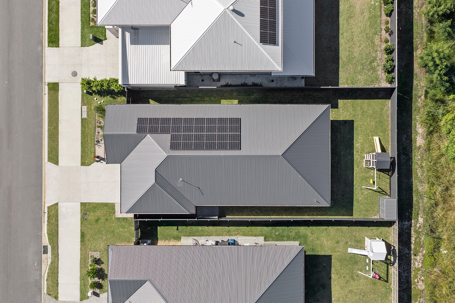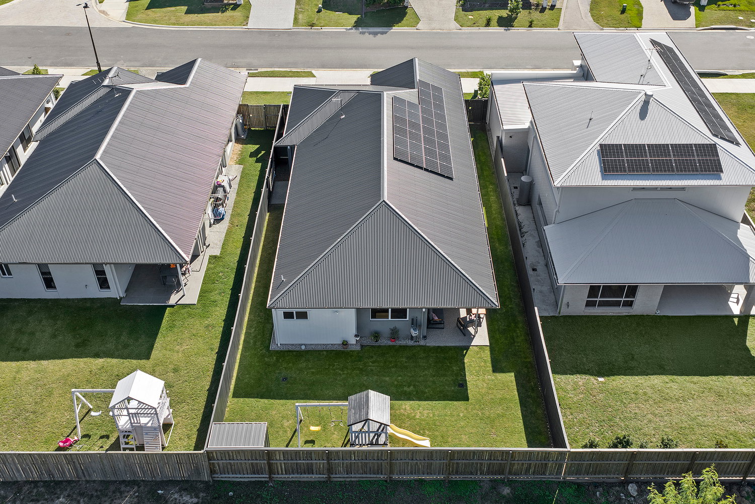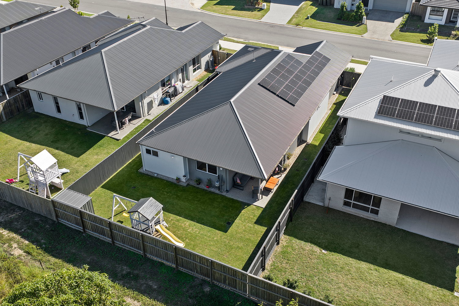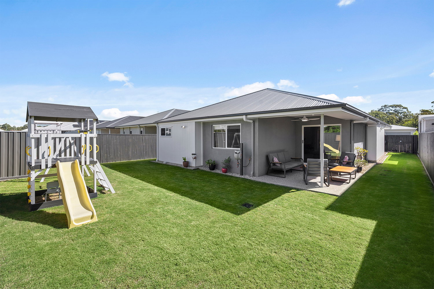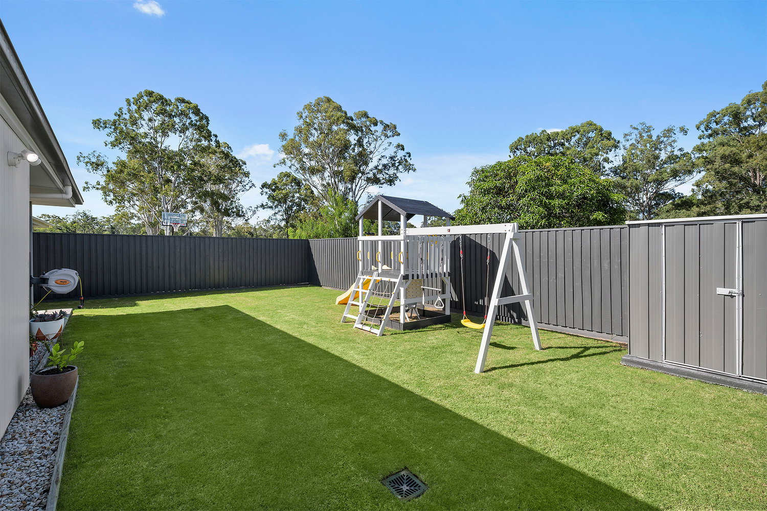 # Backyard features a fun kids play area, side access and garden shed