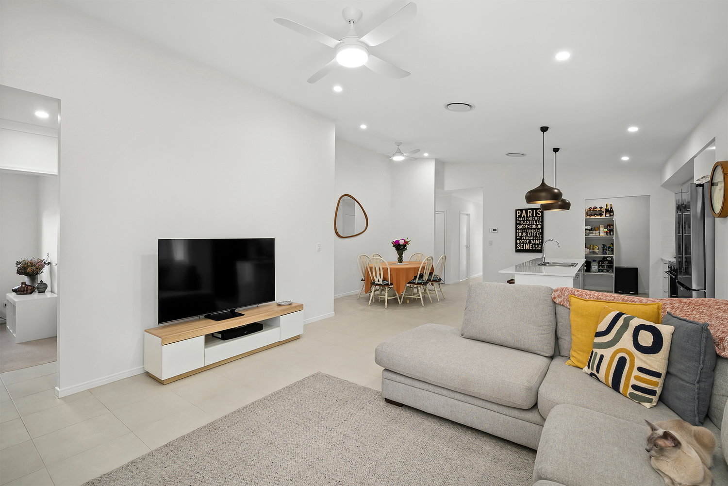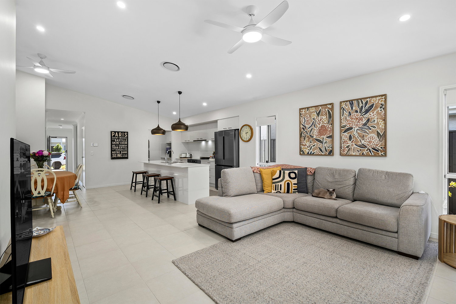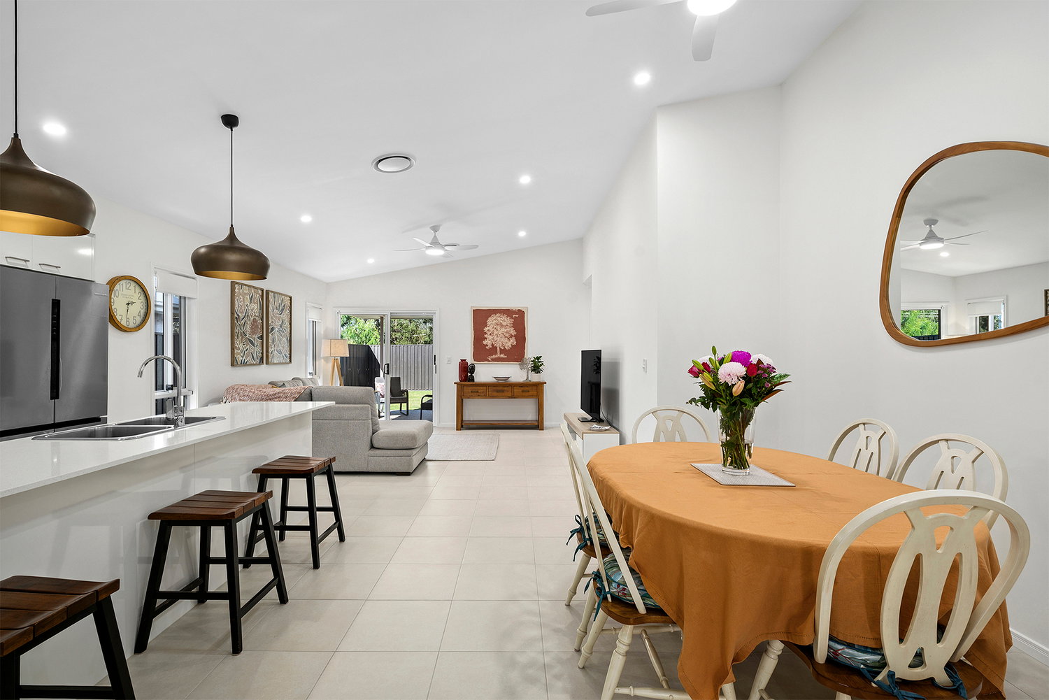 # Open-plan living and dining opening out to the covered alfresco. Giving seamless flow to outside.