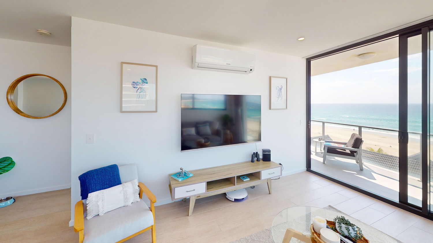 – Two modern bathrooms with high-quality fittings and finishes – Light-filled open plan living with floor-to-ceiling glass windows overlooking from Coolangatta to Surfers Paradise