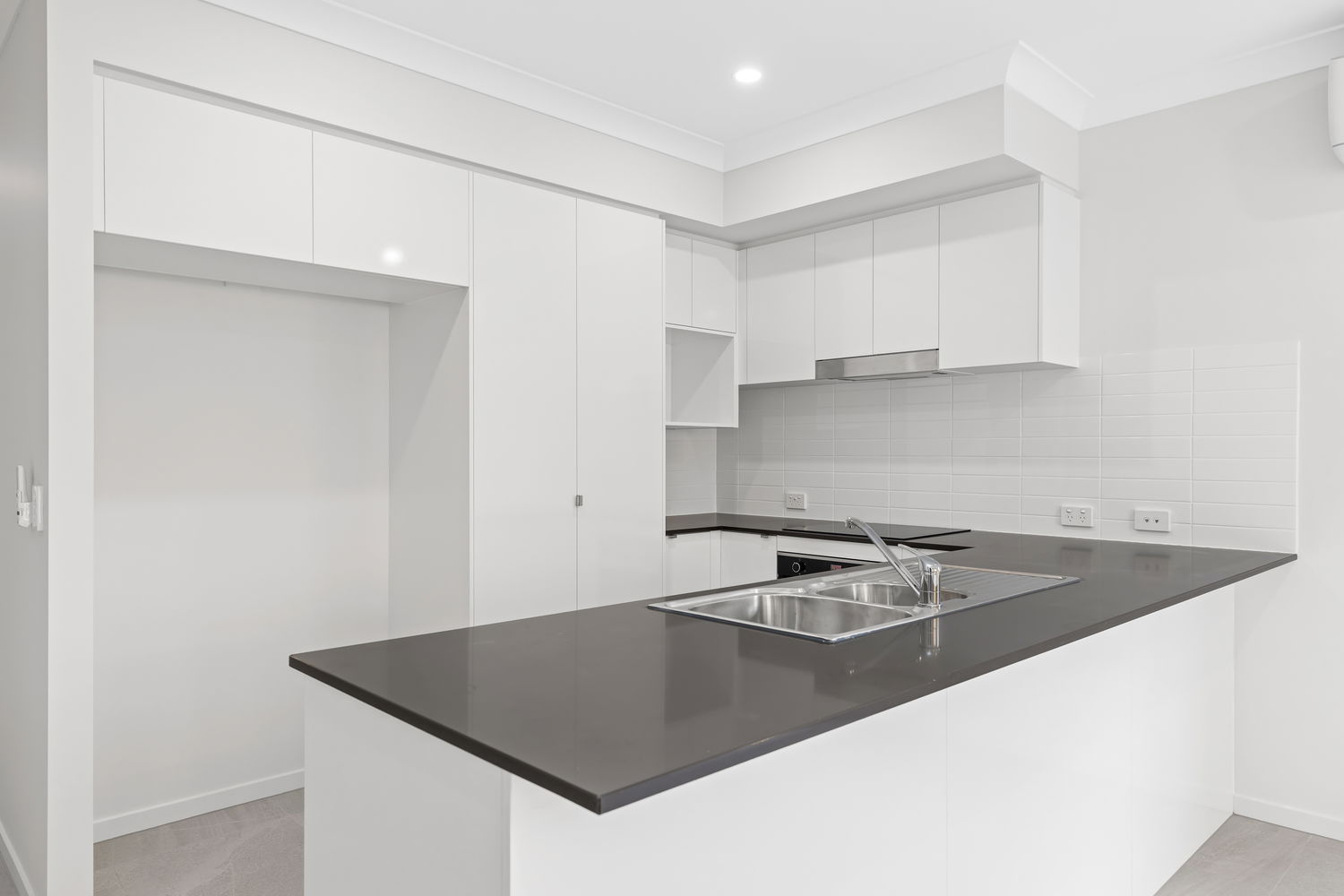 # Modern kitchen with stainless steel appliances inclusive of dishwasher, oven & rangehood. Well-sized fridge cavity and ample storage to cupboards. Kitchen bench doubles as breakfast bar.