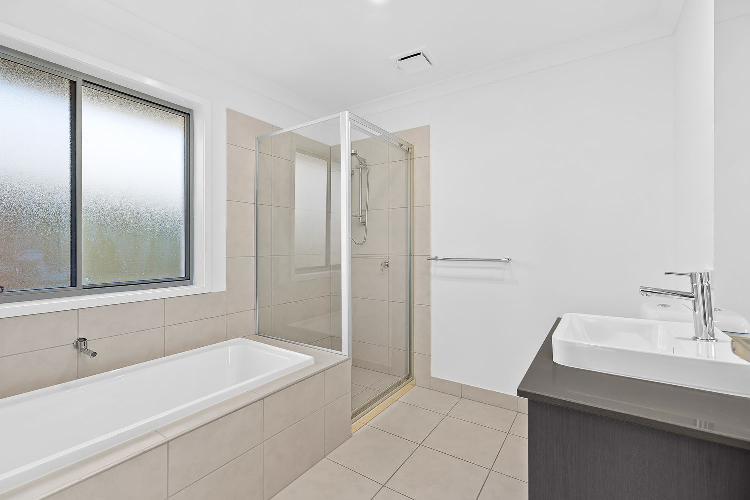 # Large main bathroom with ample storage to vanity, large shower cavity and bathtub.