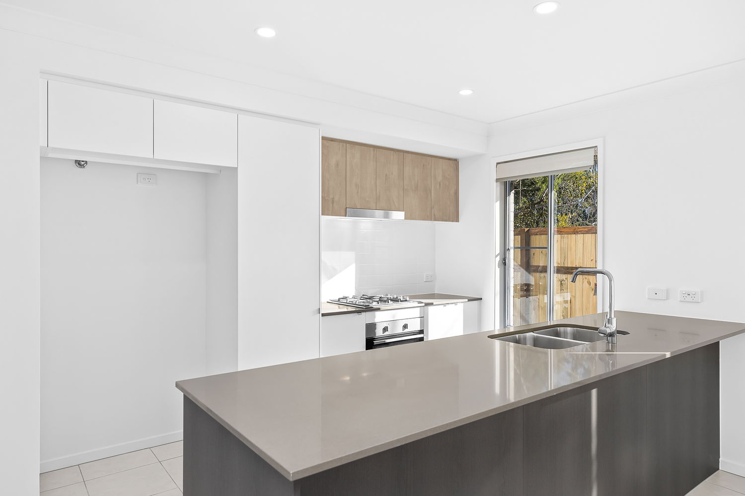# Large sized fridge cavity and stone benches also doubling as breakfast bar.