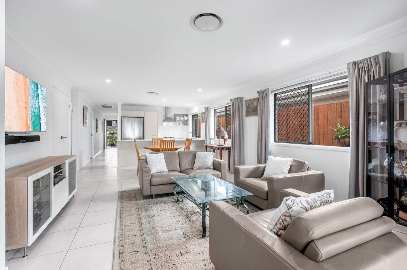 # Large Open plan tiled living and dining with ducted air conditioning and ceiling fan opening to large covered entertaining area