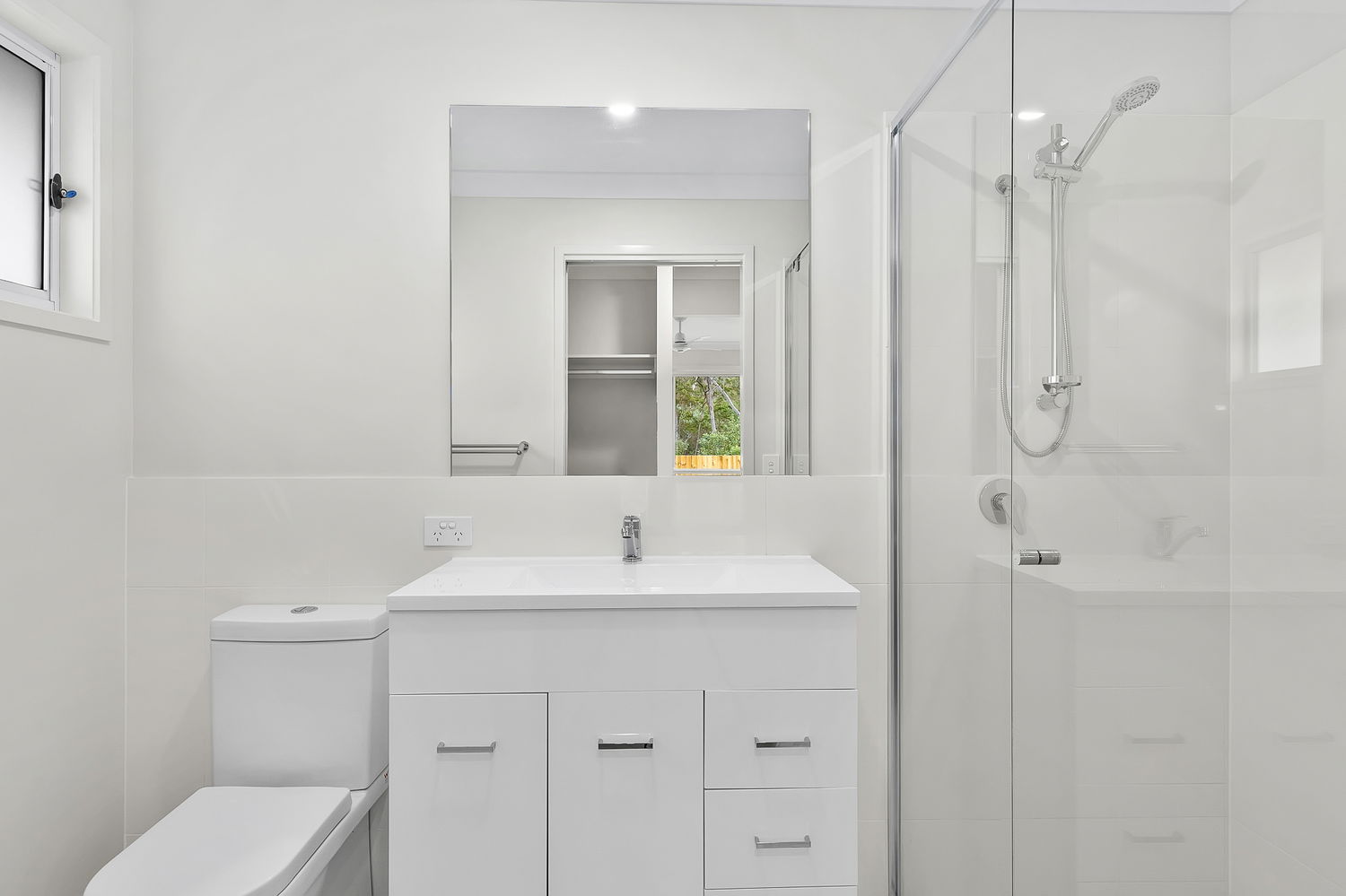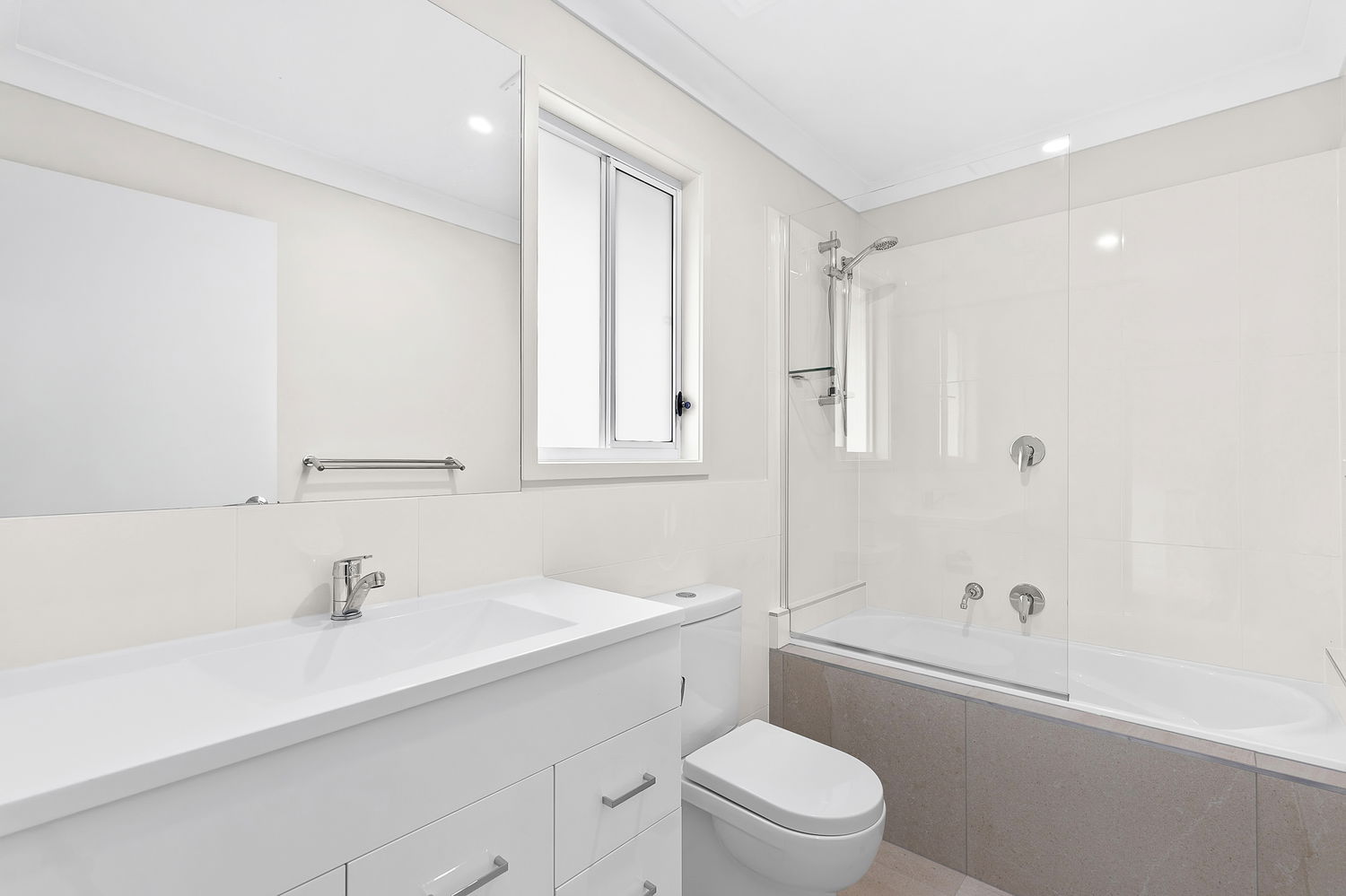 # Main bathroom with large shower cavity, bathtub and ample storage to vanity