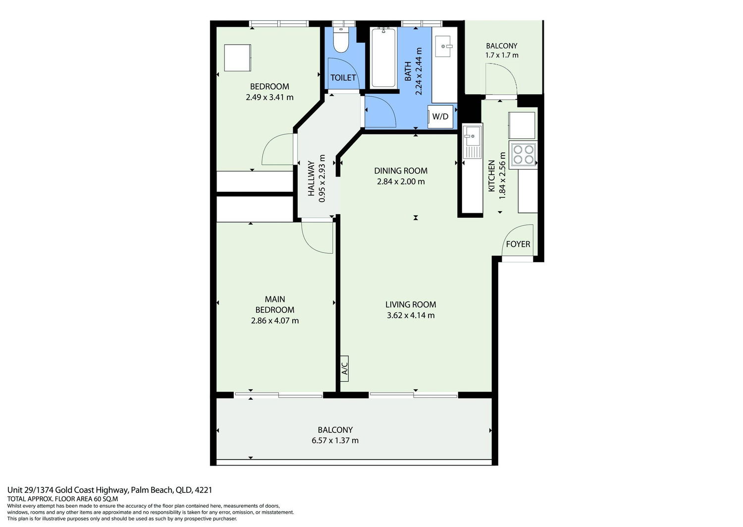 Inside, the open-plan living area is air-conditioned and flows seamlessly onto a private balcony—ideal for relaxing or entertaining. The kitchen is light-filled and opens to a second sunny balcony, adding to the airy feel of the space.