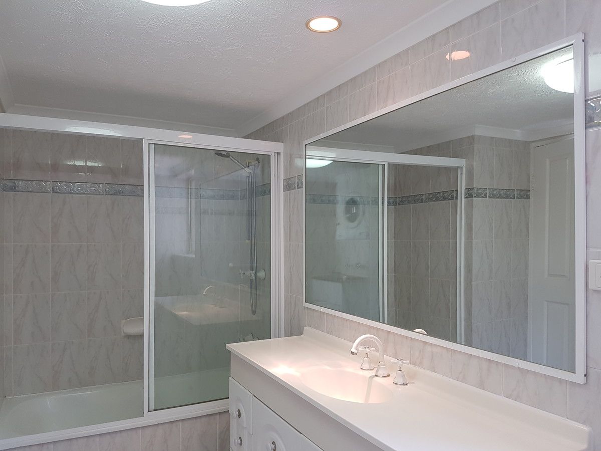 # The main bathroom features a shower over a full-length bathtub and an extended vanity, while the laundry is conveniently integrated within the bathroom.